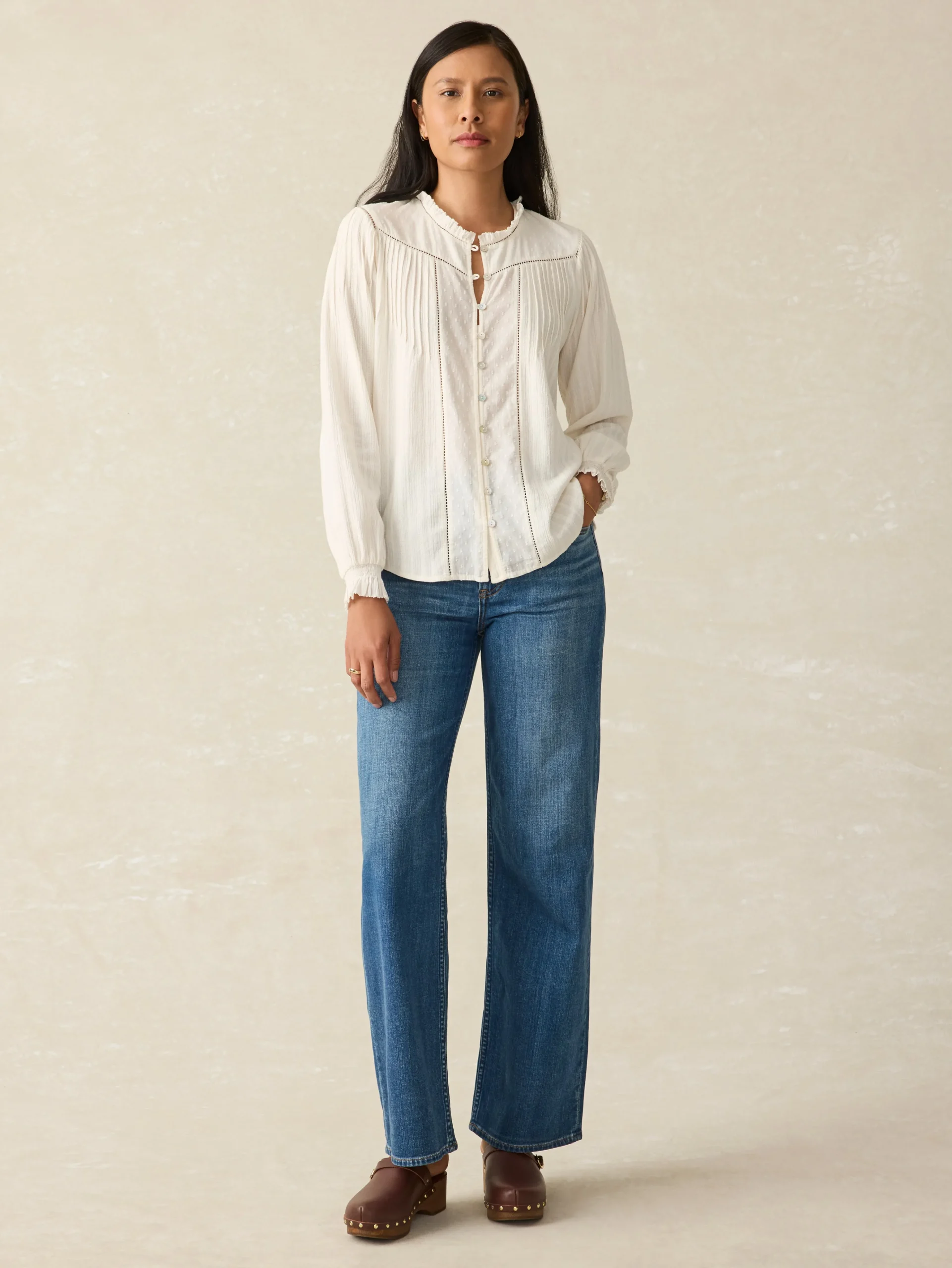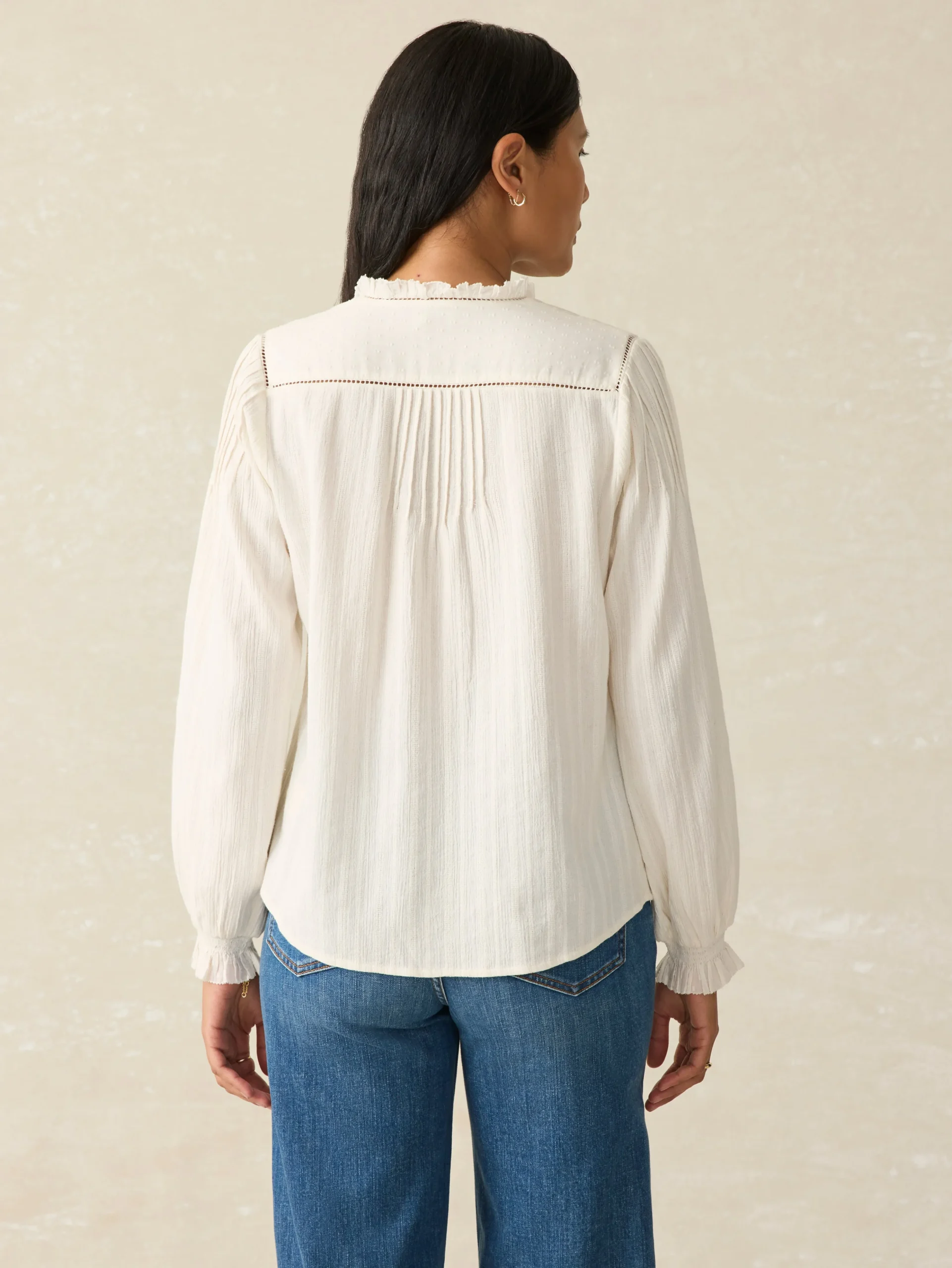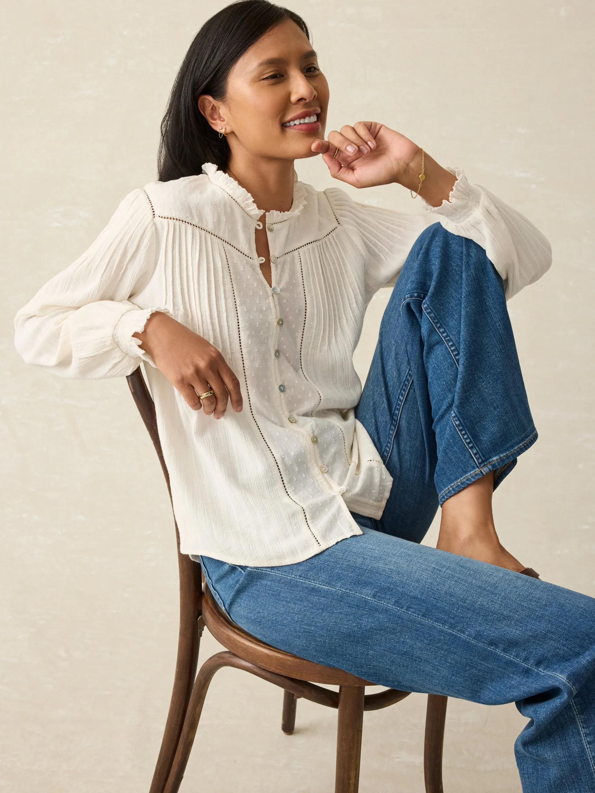Our new fall top flows like a dream with artisanal details that elevate it from the everyday. With delicate pintucks at the bodice, charming ladder trim inserts, and a cotton dobby combination fabric that gives a lovely ruffle, this blouse exudes a low key romantic charm. Balance the look with your favorite jeans for an outfit that’s perfect for just about every meetup.