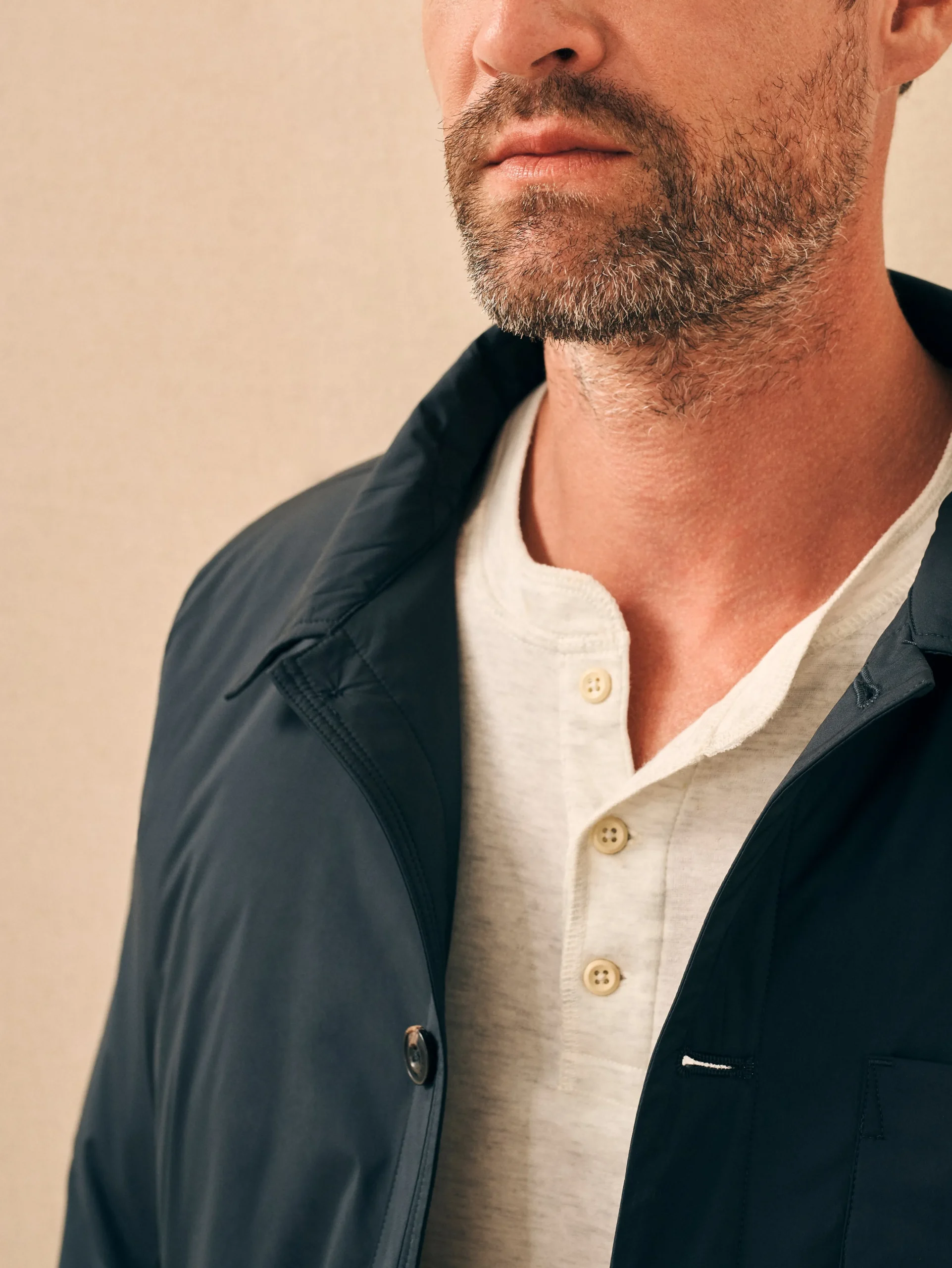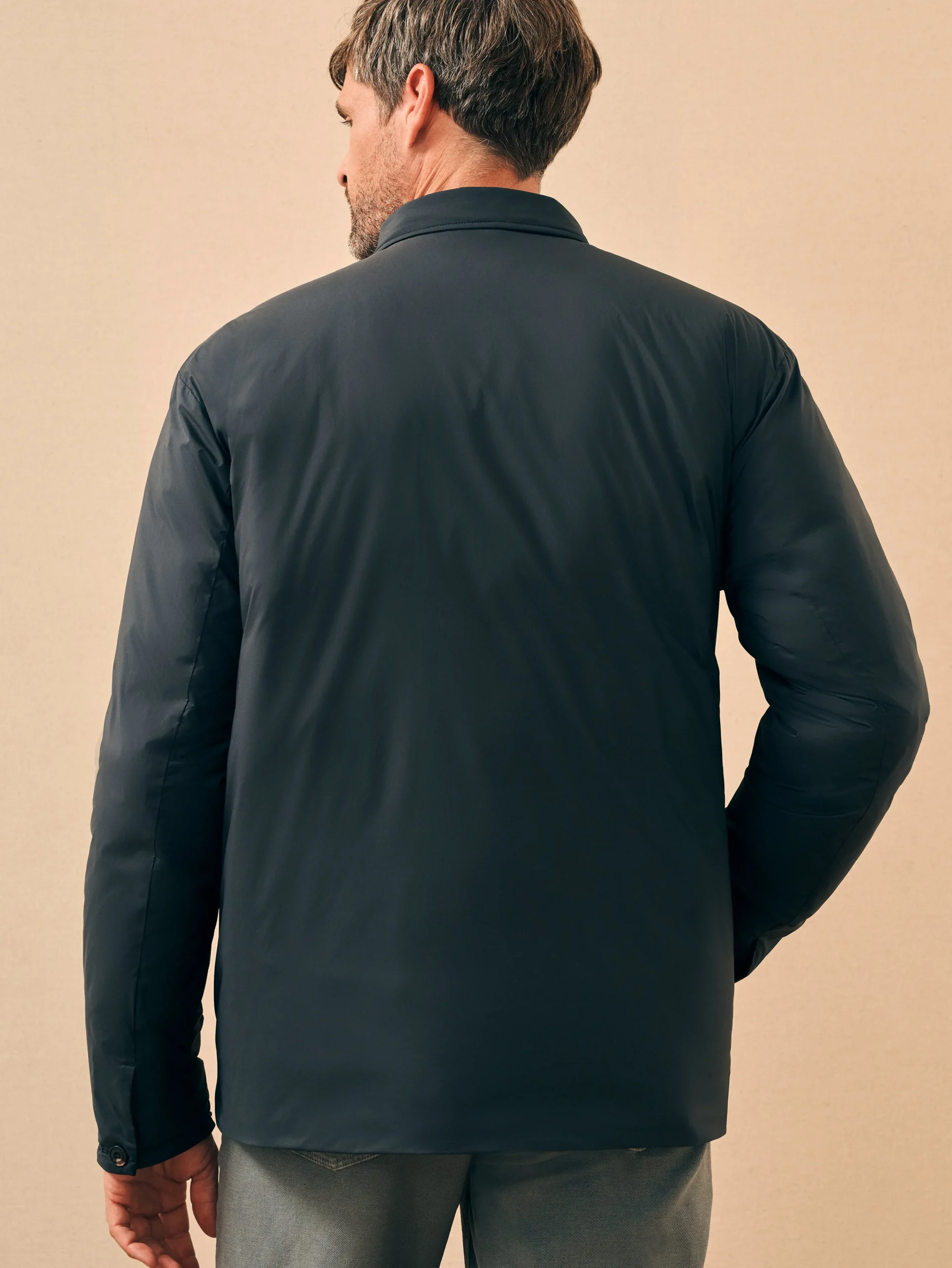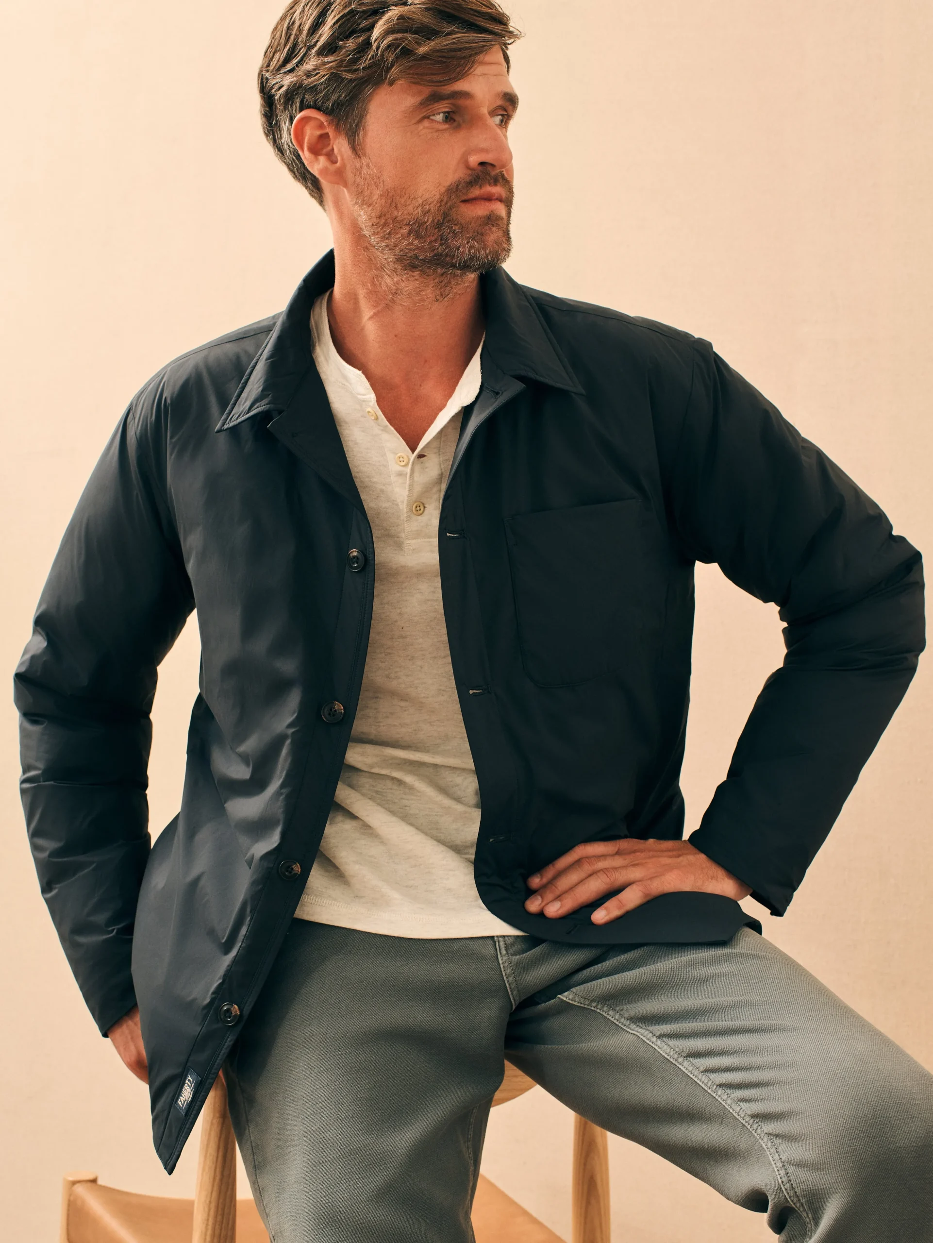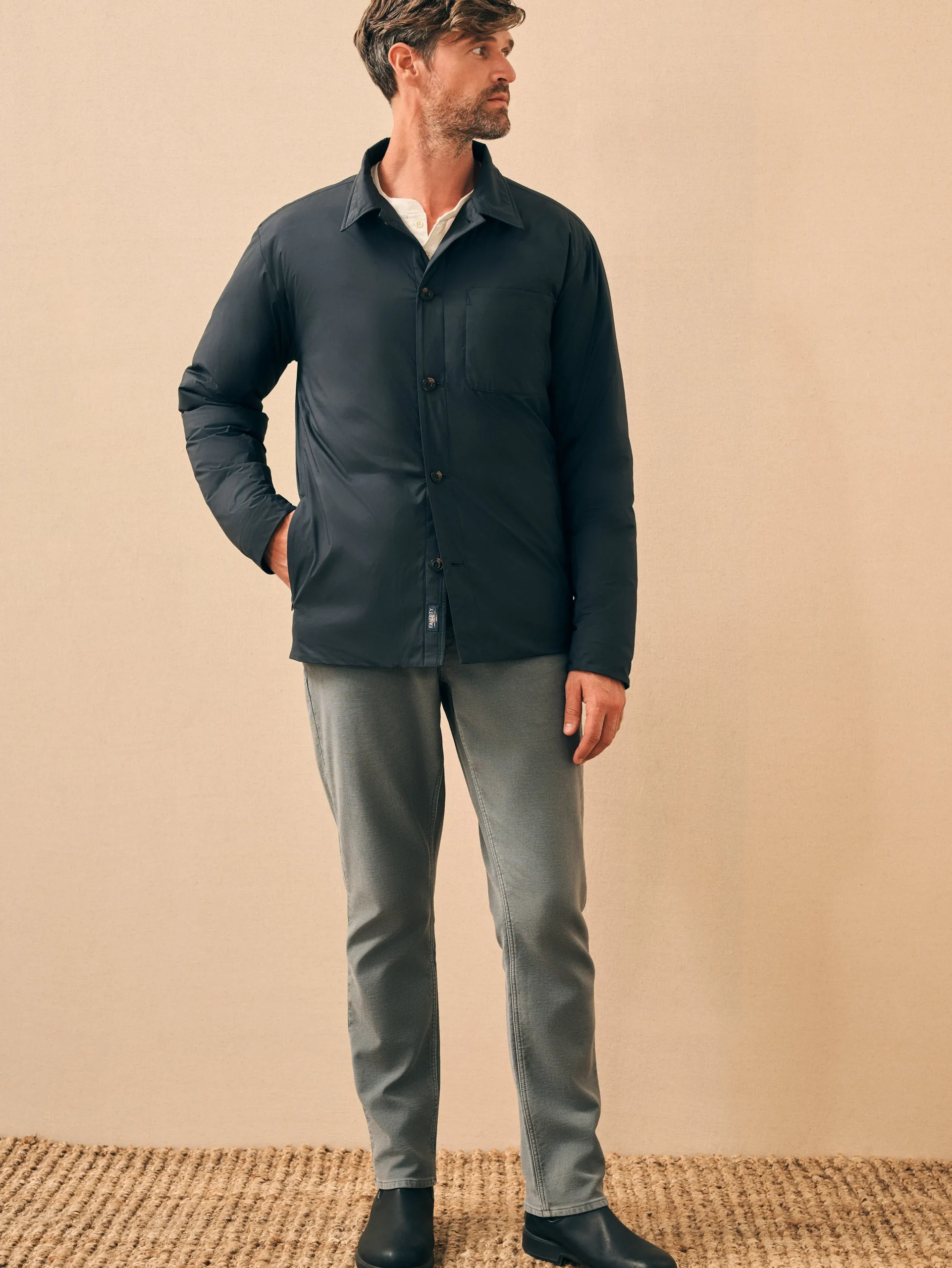 - Detail: Button closure at center front. Patch pocket at wearer’s left chest. Lower zip pockets hidden into forward side seams. Two interior zip pockets. Woven Faherty label on under placket. Signature brand stripe locker loop at interior neck seam. Insulated and quilted. Recycled Neokdun® down insulation from Navarpluma. https://neokdun.com/