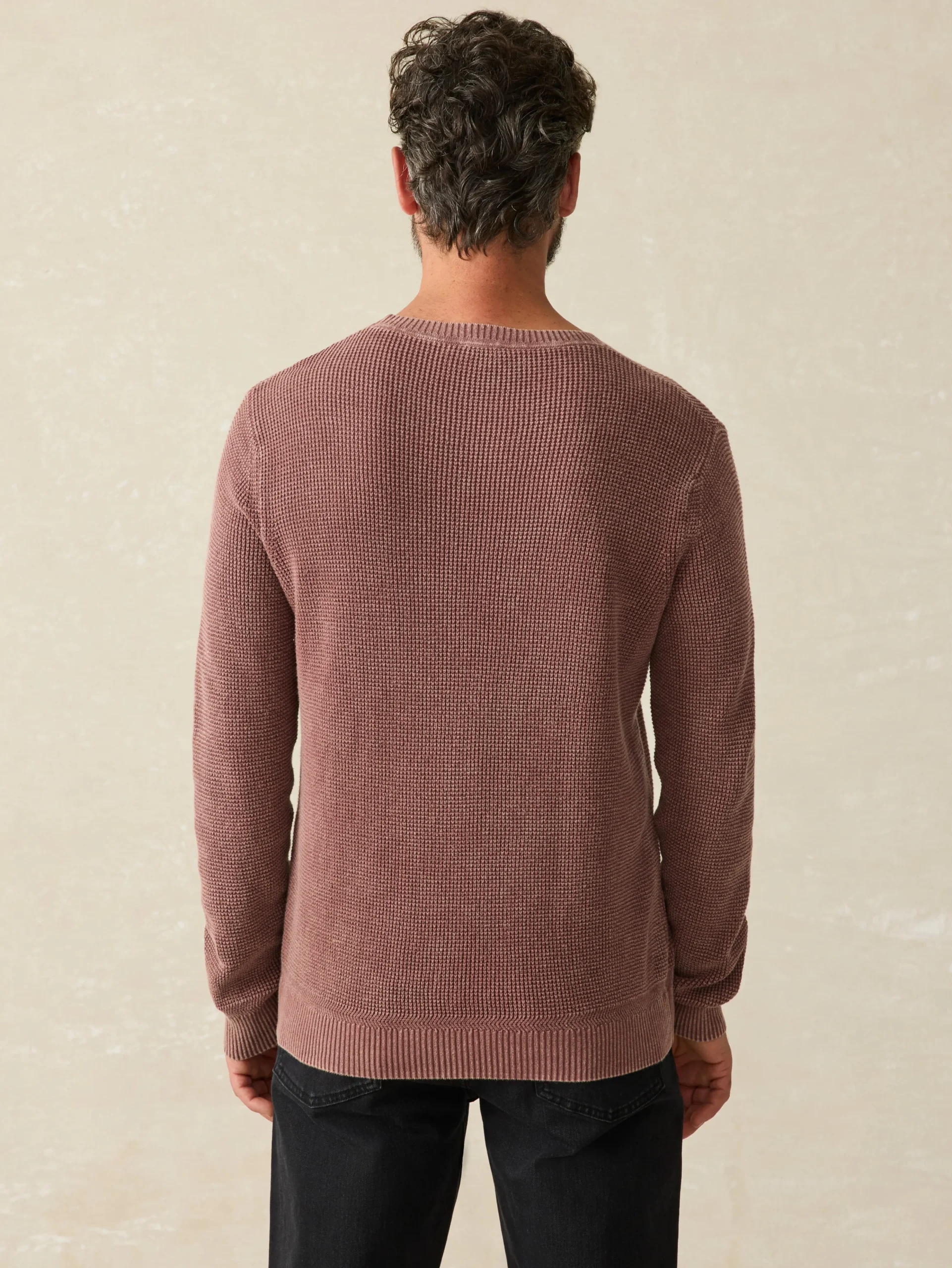 Designed as an easy to wear, transitional sweater., this will be your go-to year-round crew. Our cotton yarn is super soft but not overly warm and knit in an airy, waffle stitch giving the sweater dimension and texture. It’s then garment-dyed and washed for a lived in, vintage look and feel that’s casually cool for any occasion.