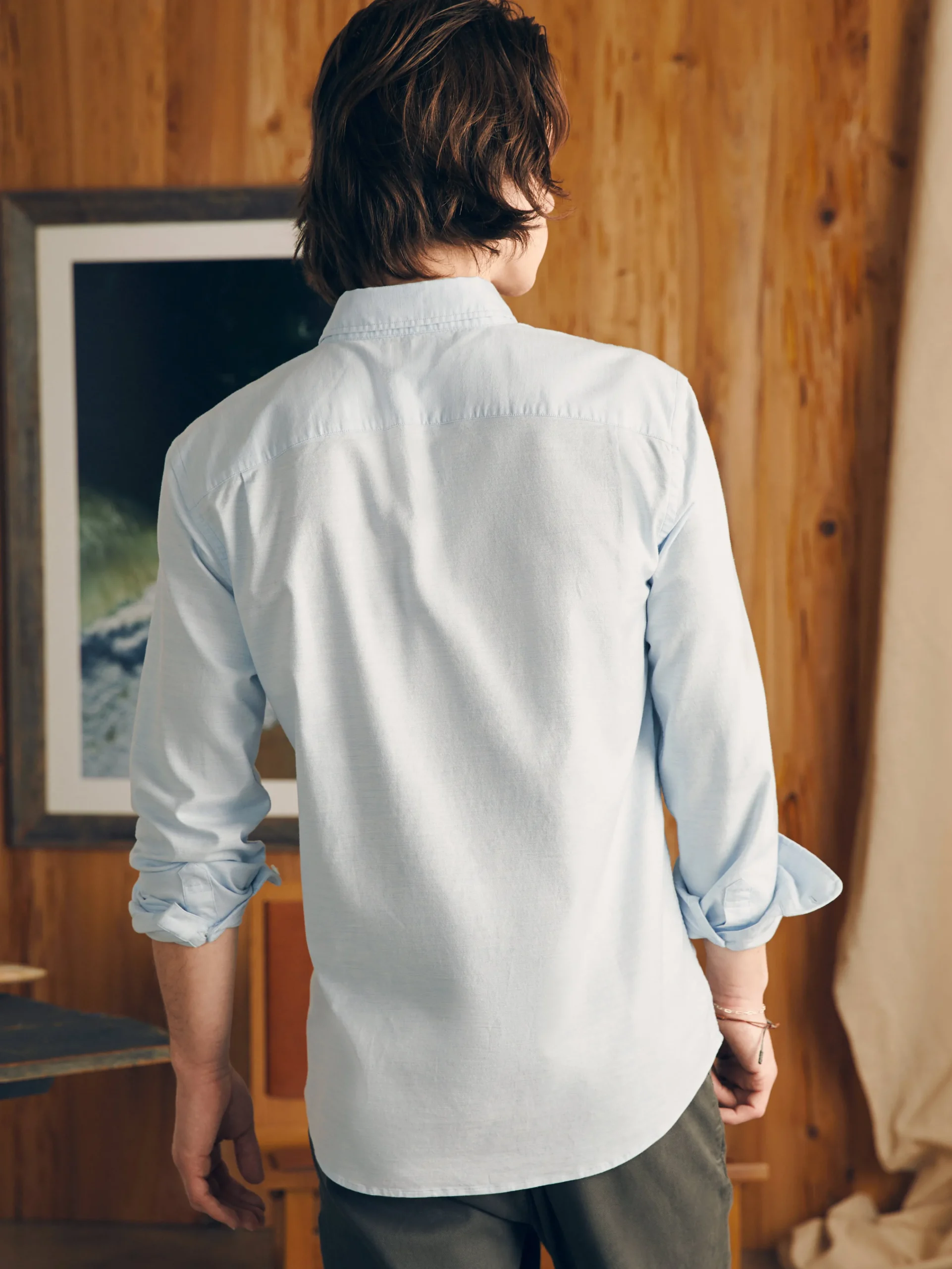 - Detail: Button-down collar. Button front and cuffs. Chest patch pocket. Shirttail hem. Woven “Sun & Wave” label at under placket