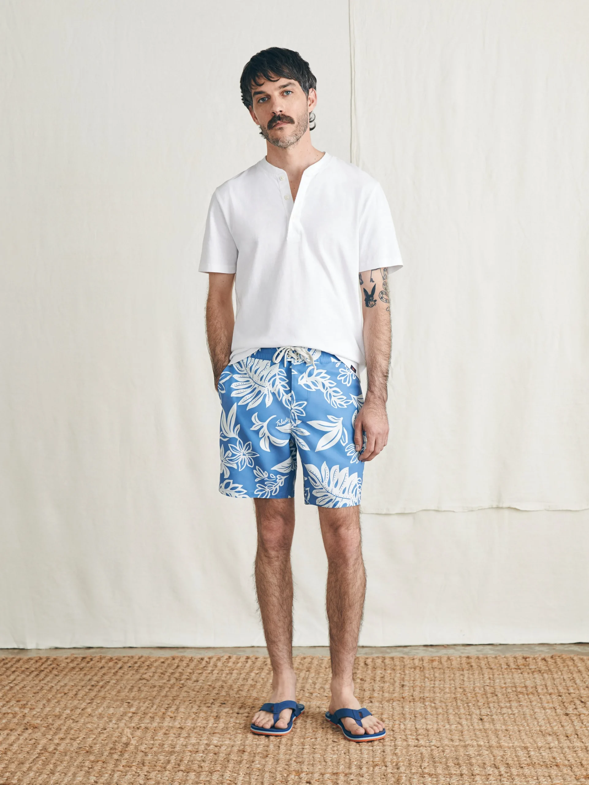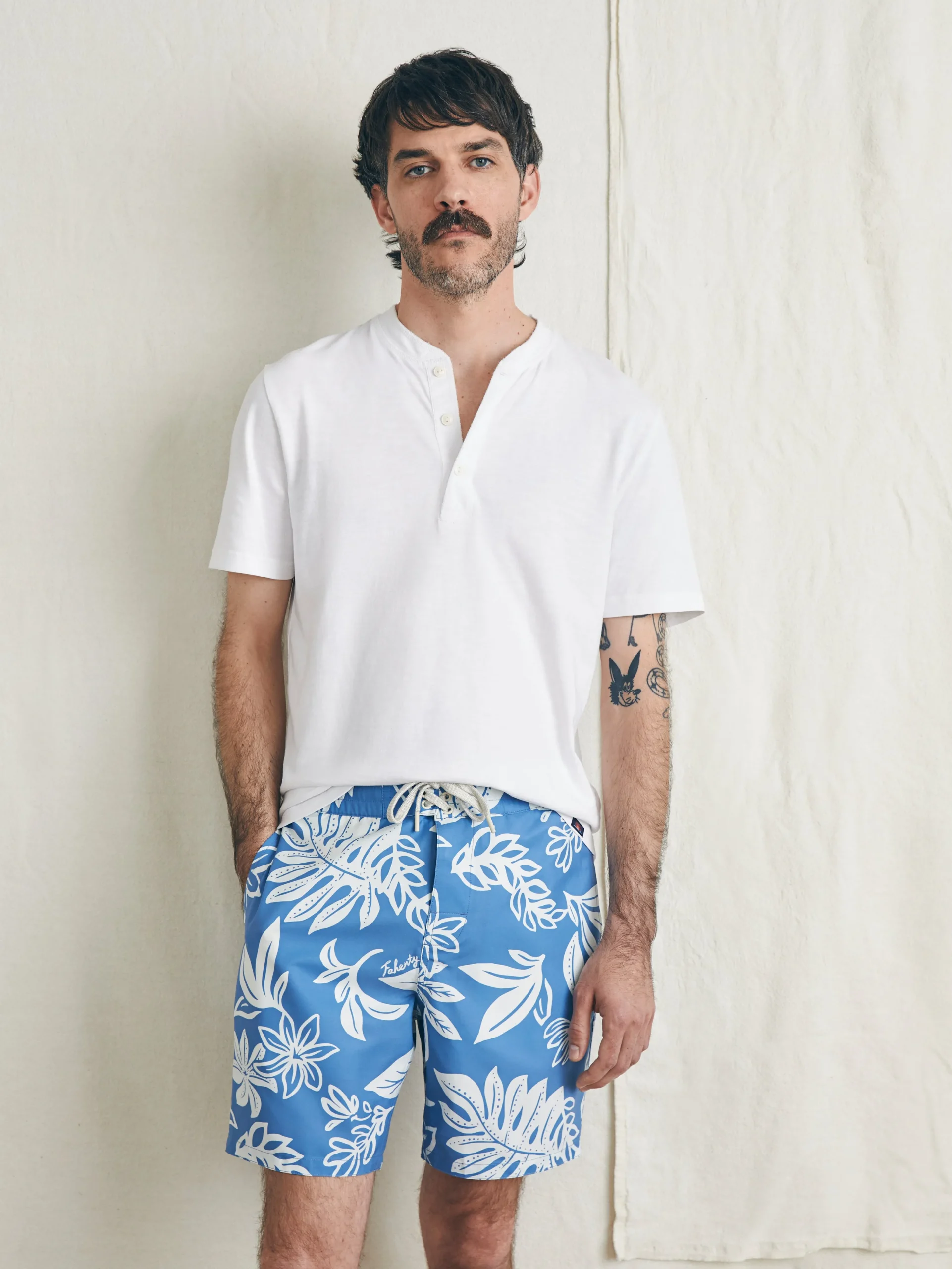 - Detail: Two side seam pockets. Hidden zipper pocket inside wearer’s left front pocket. Classic boardshort drawcord tie closure. Patch pocket at wearer’s right backside with button flap closure. Mesh piecing at pocket bags for easy water drainage. Button fly closure.