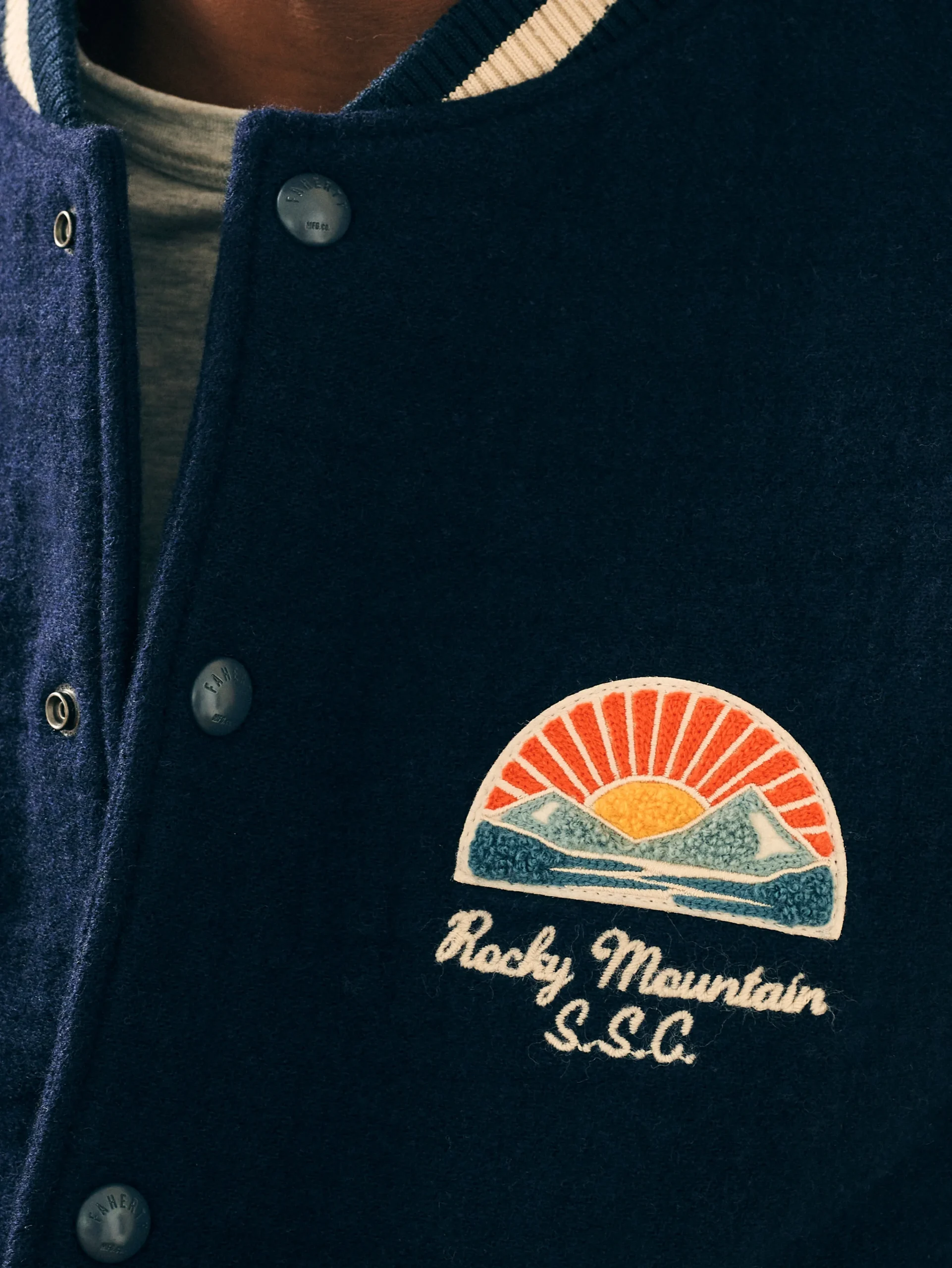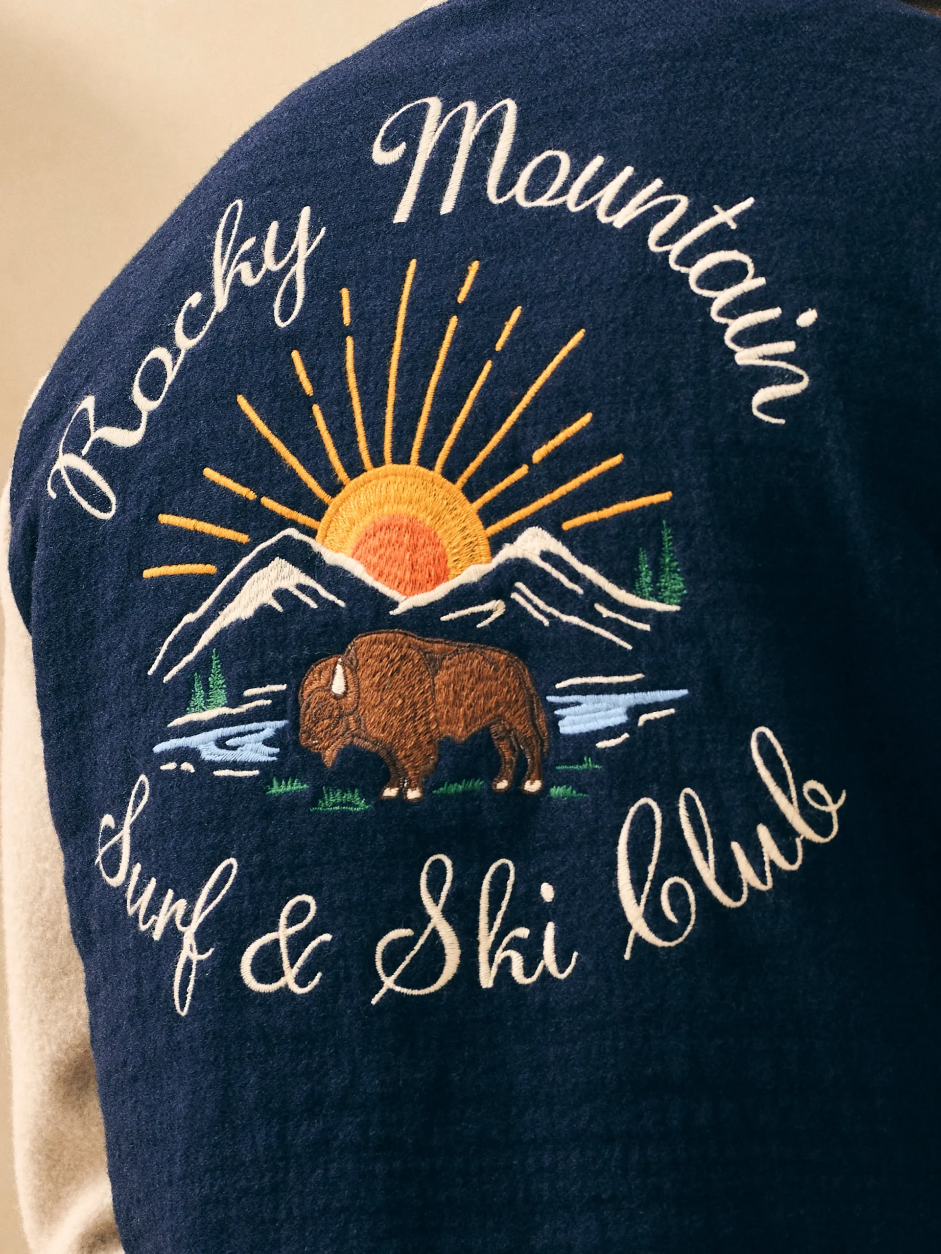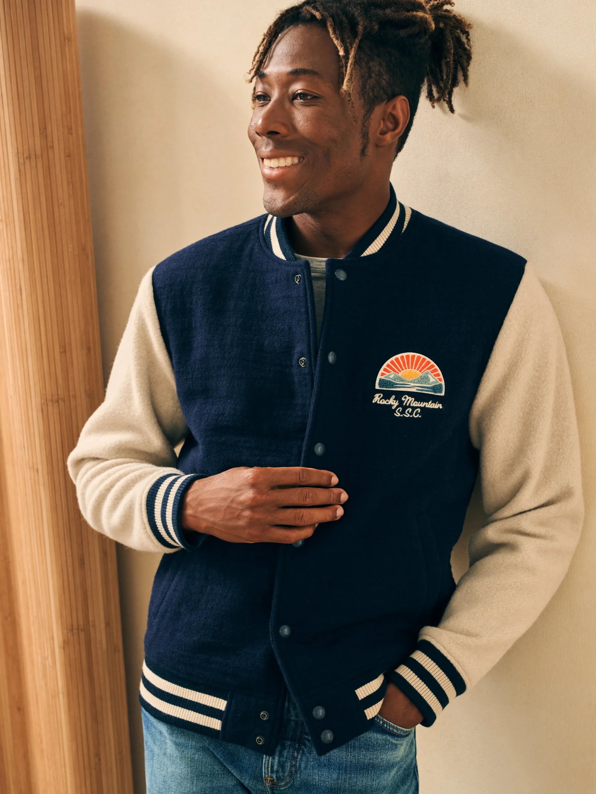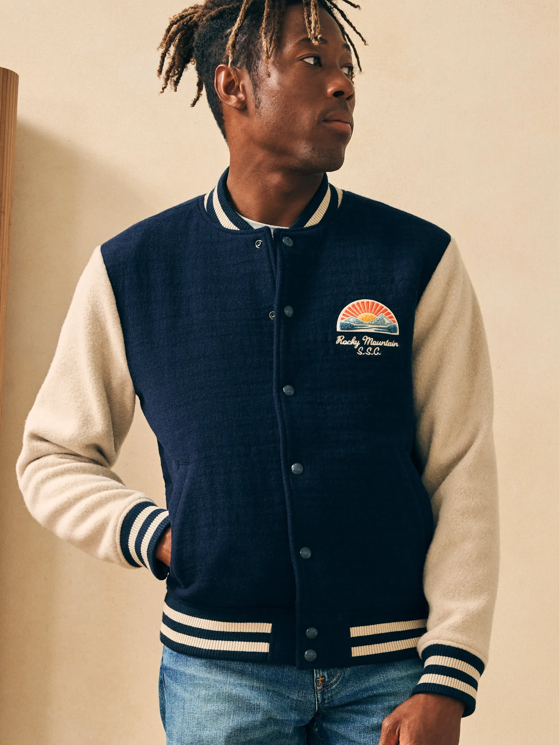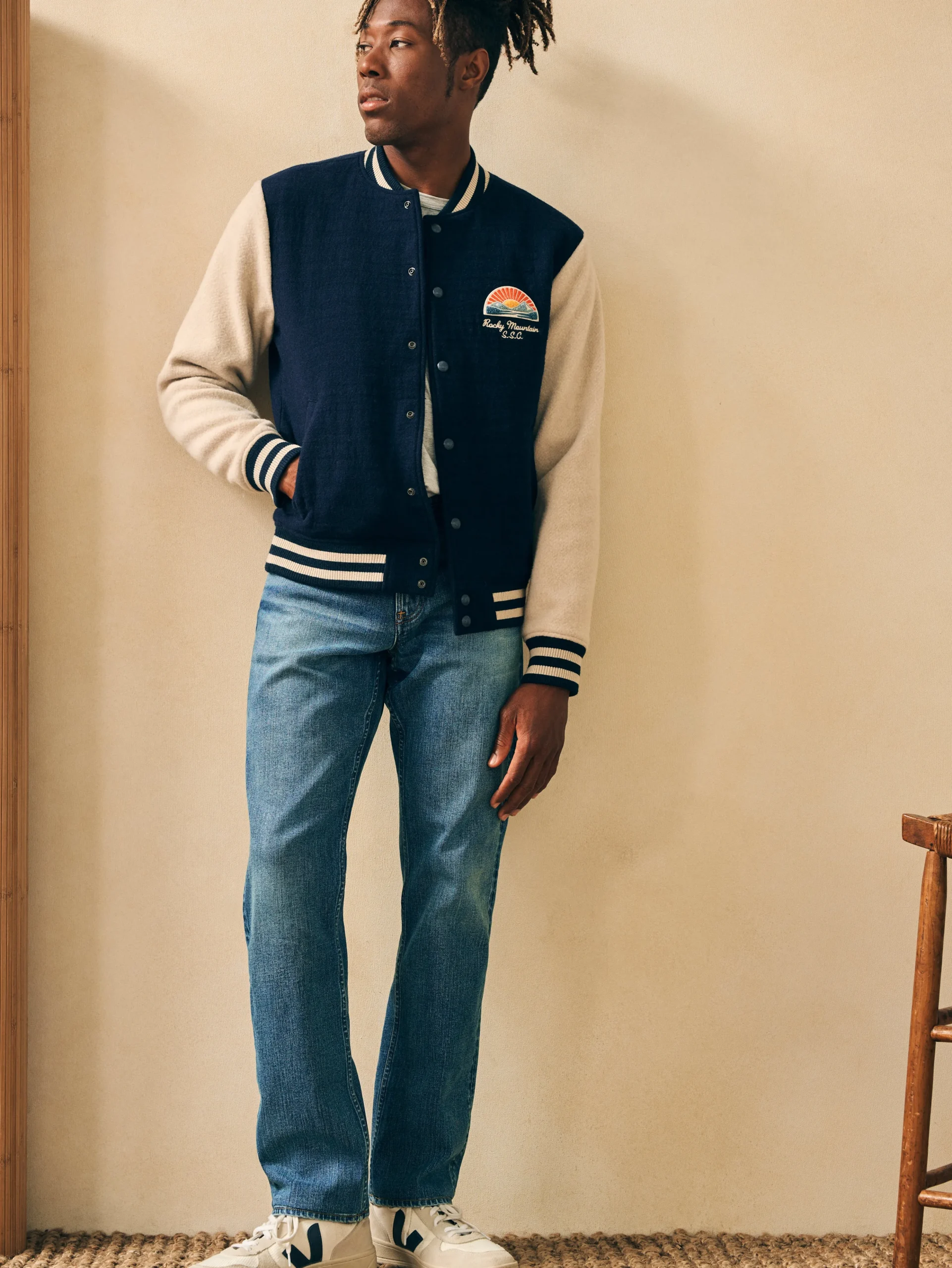 An oldie but a goodie – this throwback varsity jacket has all the classic sporty stylings you remember, updated with a Faherty touch inspired by the great outdoors. From the front chenille patch to the back which features a large embroidered panel of custom Rocky Mountain-themed graphics, this is the unexpected layer that pulls together any outfit with that casual cool character.