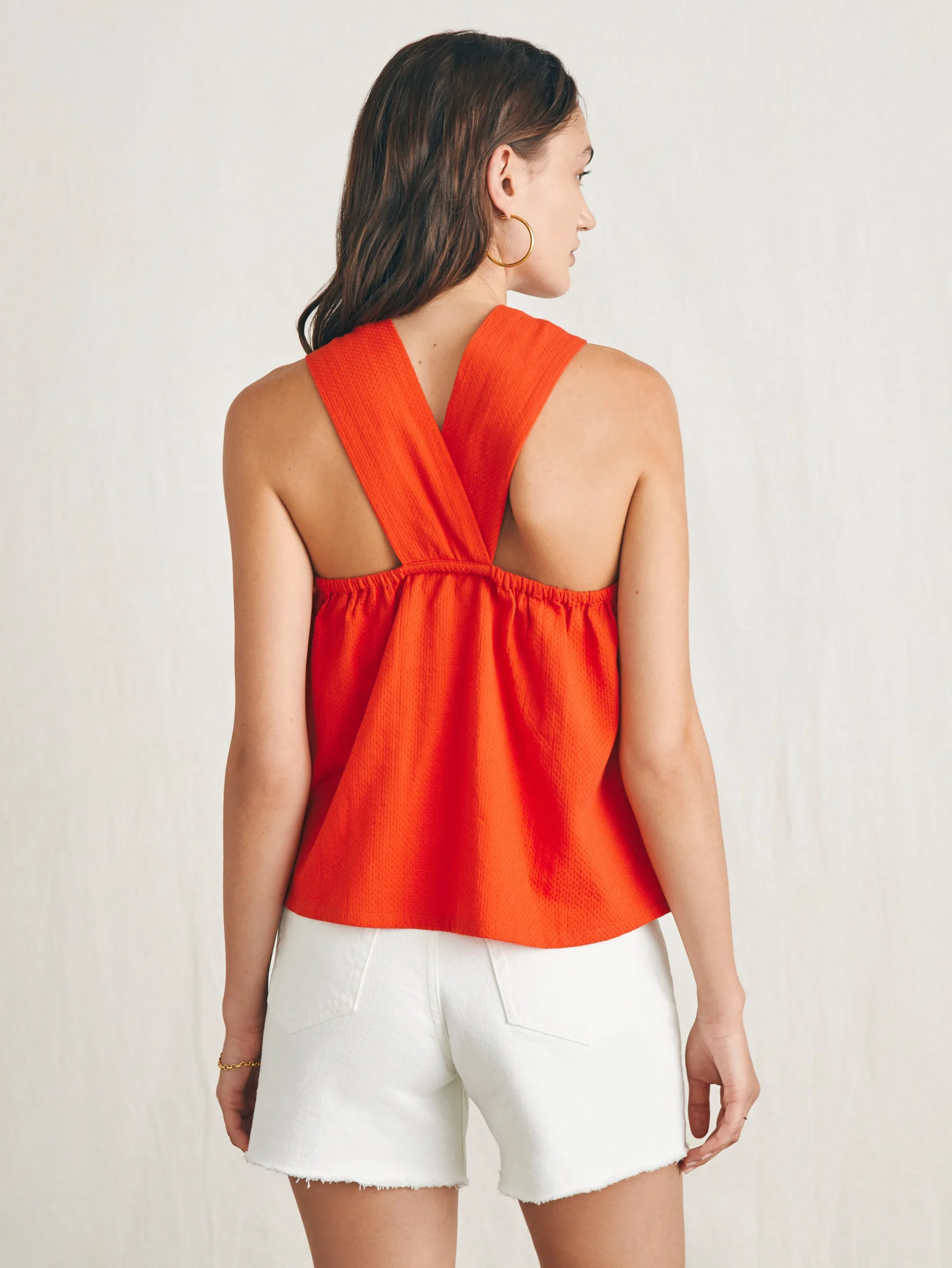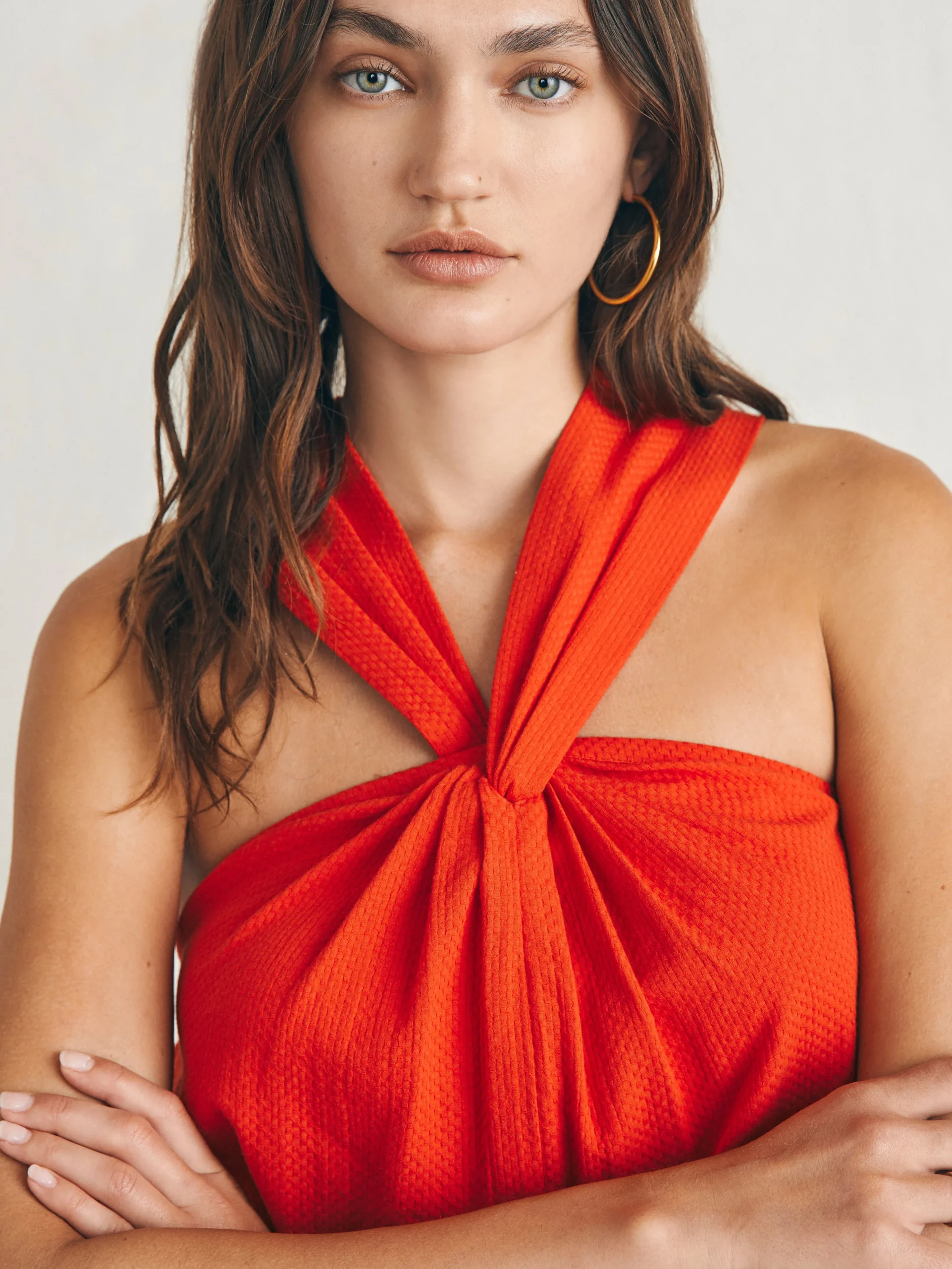 - Detail: Halter neckline, pleated center front detail, elasticated back.