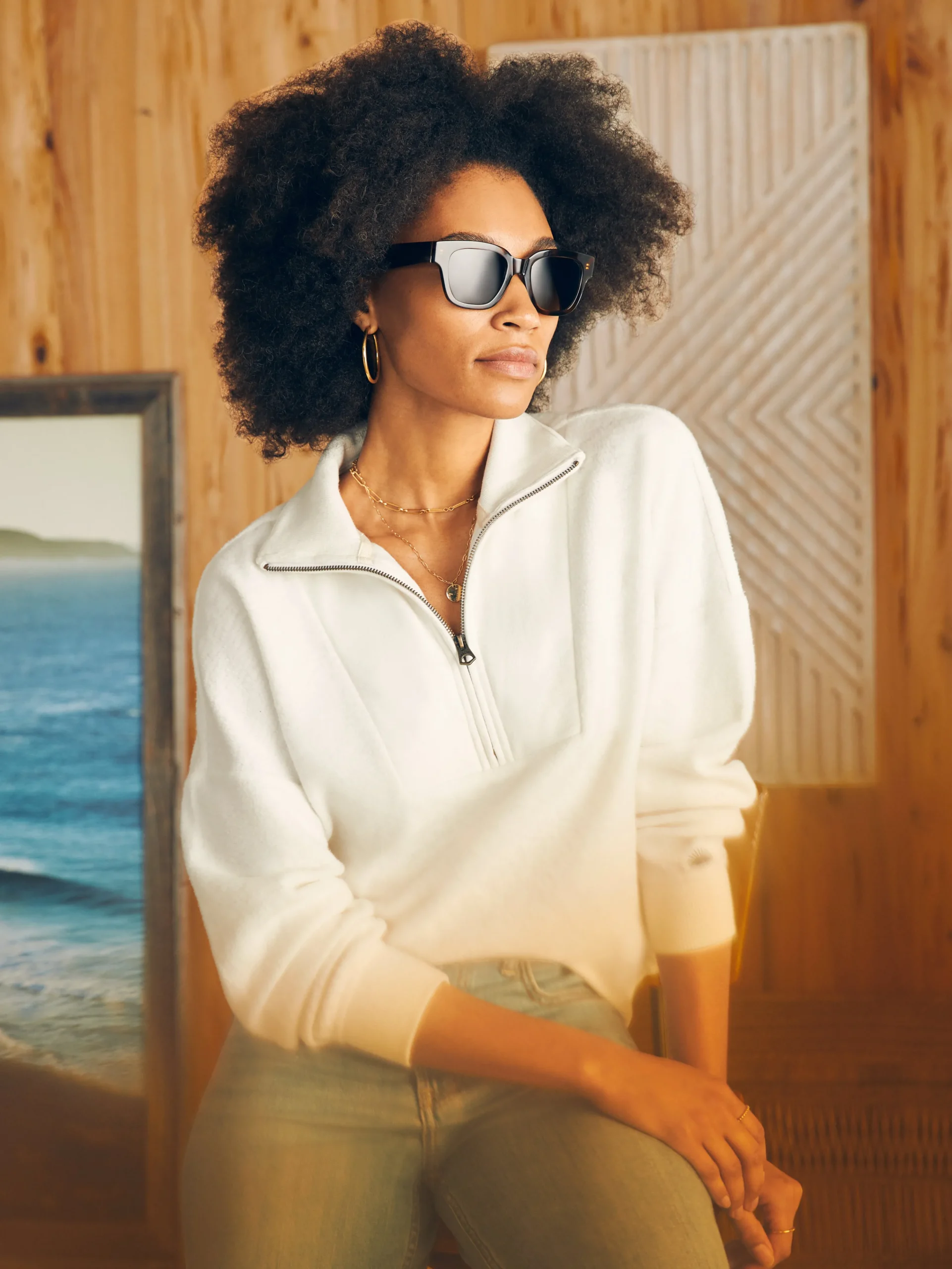 We took our favorite sweatshirt, flipped it inside out and never looked back. Made from an irresistibly soft and textured brushed terry, this relaxed quarter zip sports a washed vintage graphic inspired by the surf towns we grew up visiting with our family and friends. It’s our go-to layer post waves.