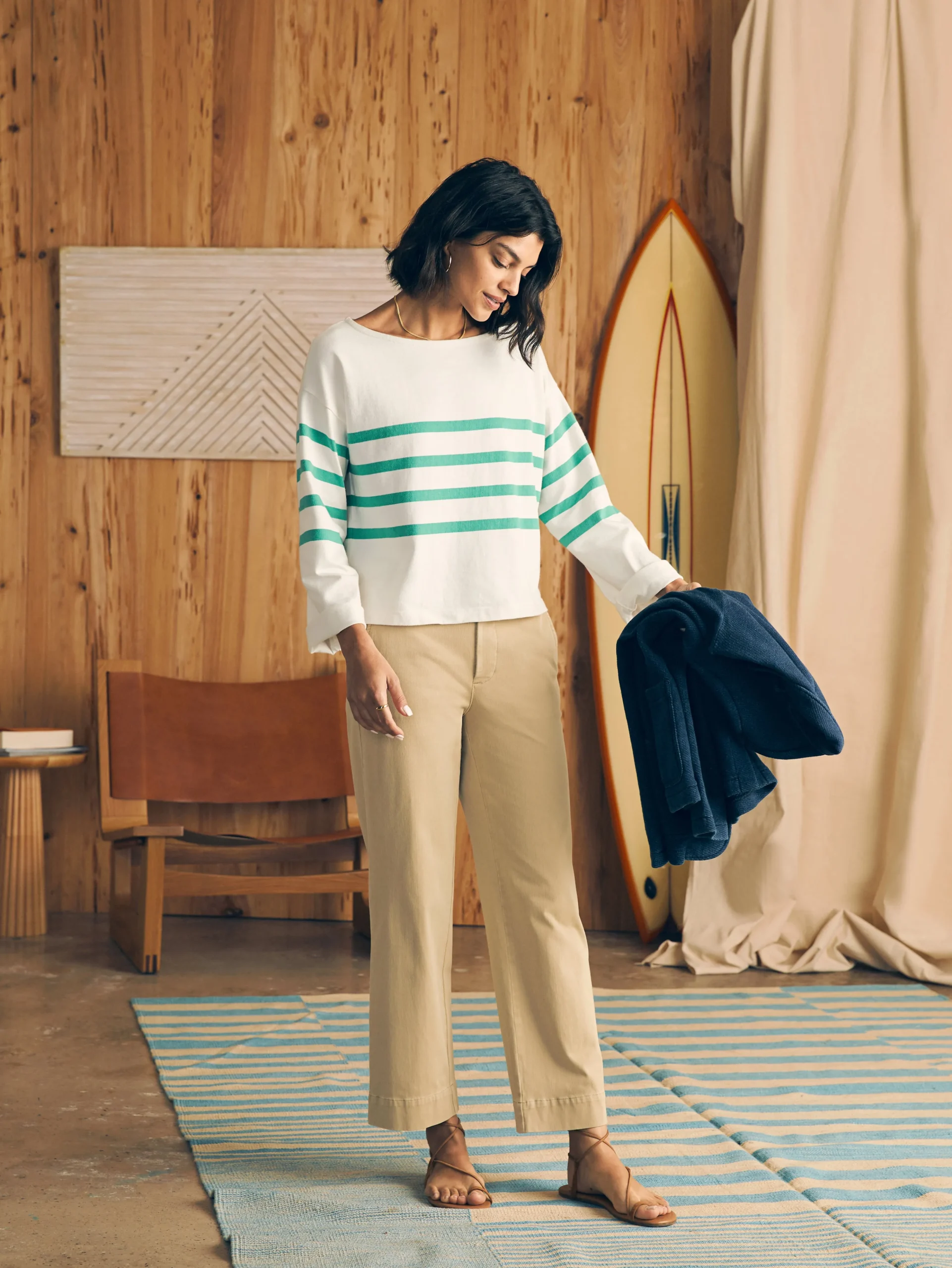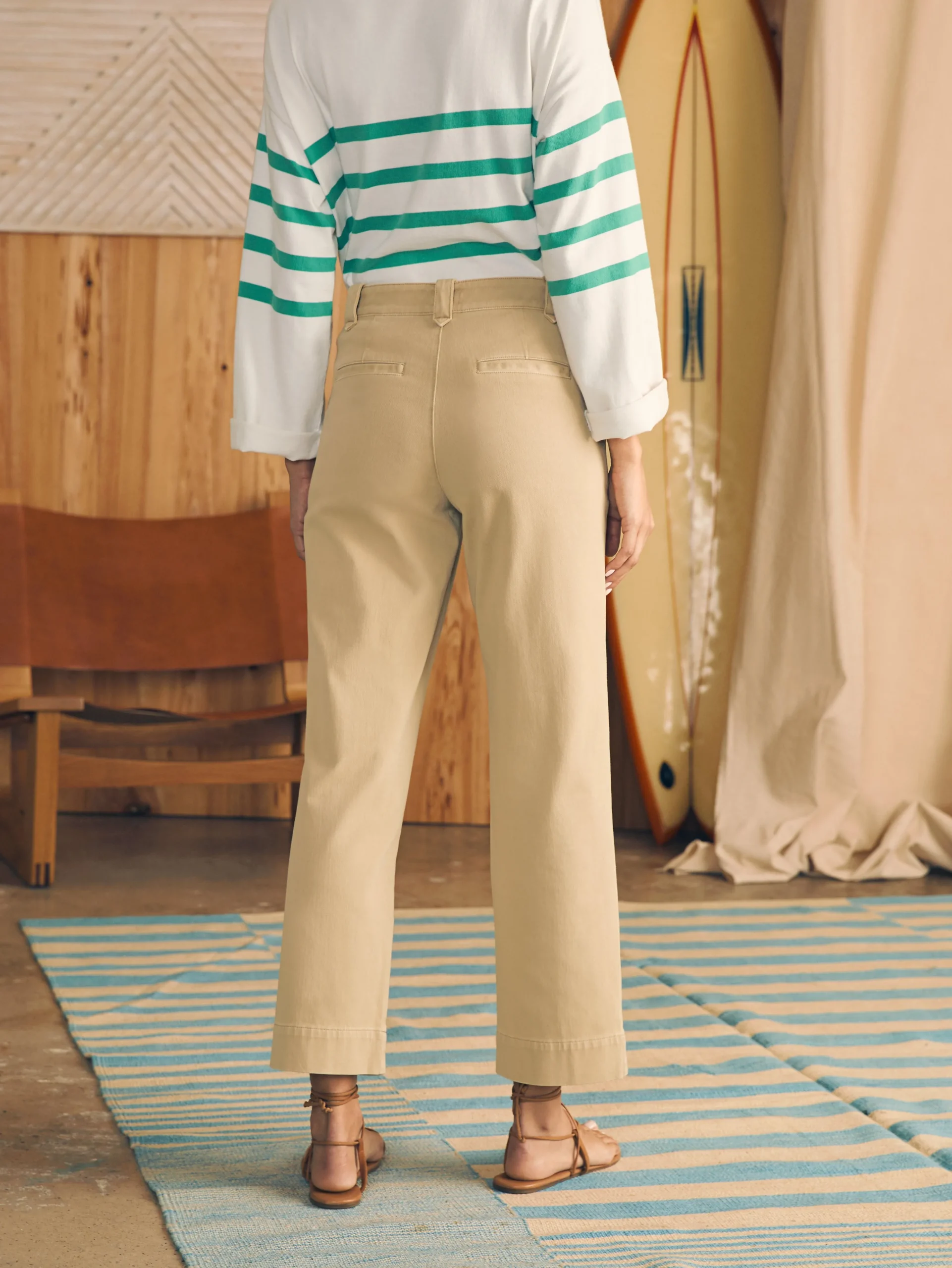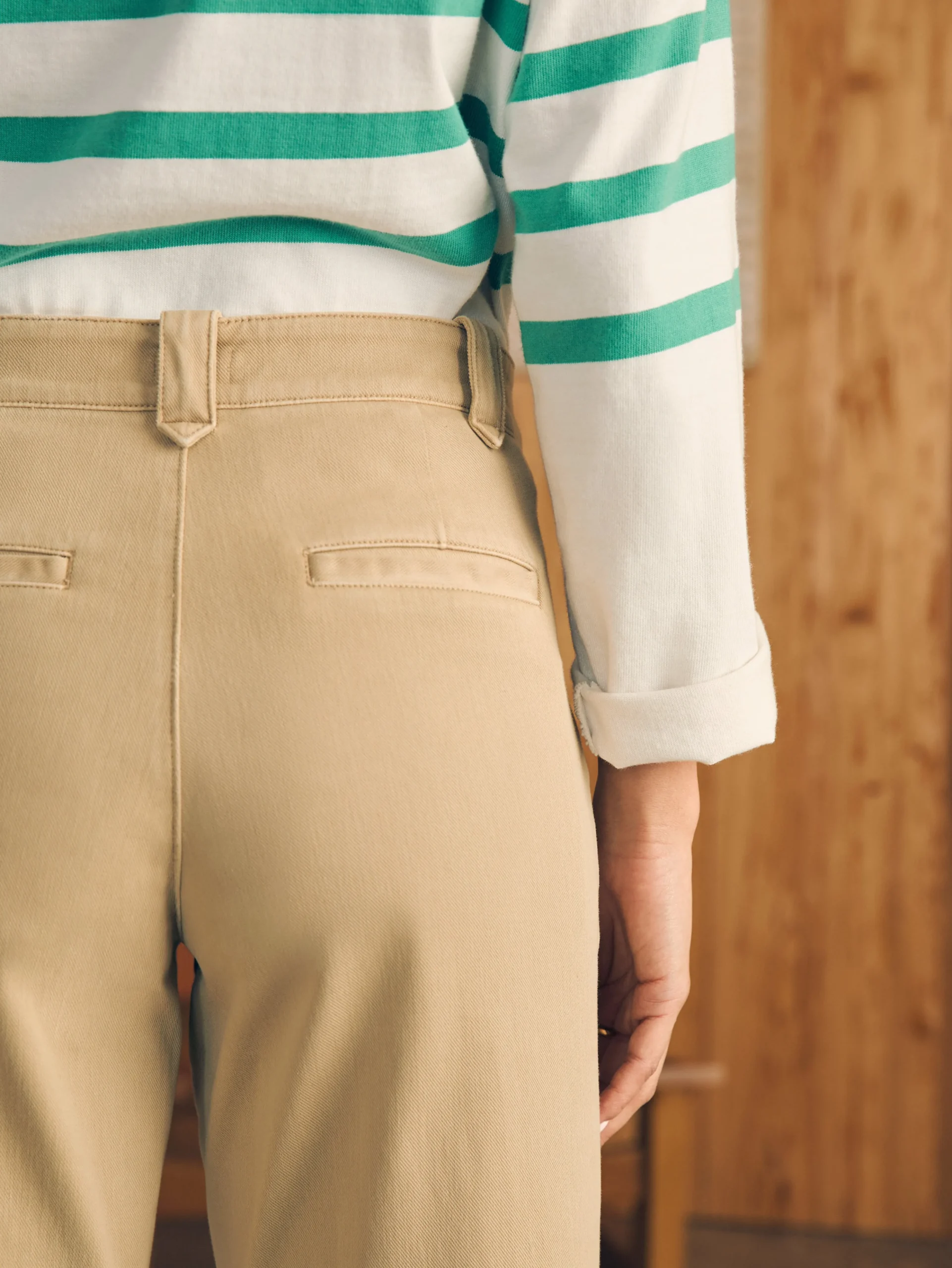 The classic and timeless chino reimagined the Faherty way. Using a midweight, woven-like knit with stretch, these wear everywhere pants have the casually polished look of the original, but way more comfortable. The straight leg tapers slightly at the hem and hits at the ankle, giving it those rolled-up beach vibes we love. Cool and understated, it goes with everything from slouchy button-downs to fitted tees. Due to their high stretchability, we recommend sizing down if you want a more tailored fit.