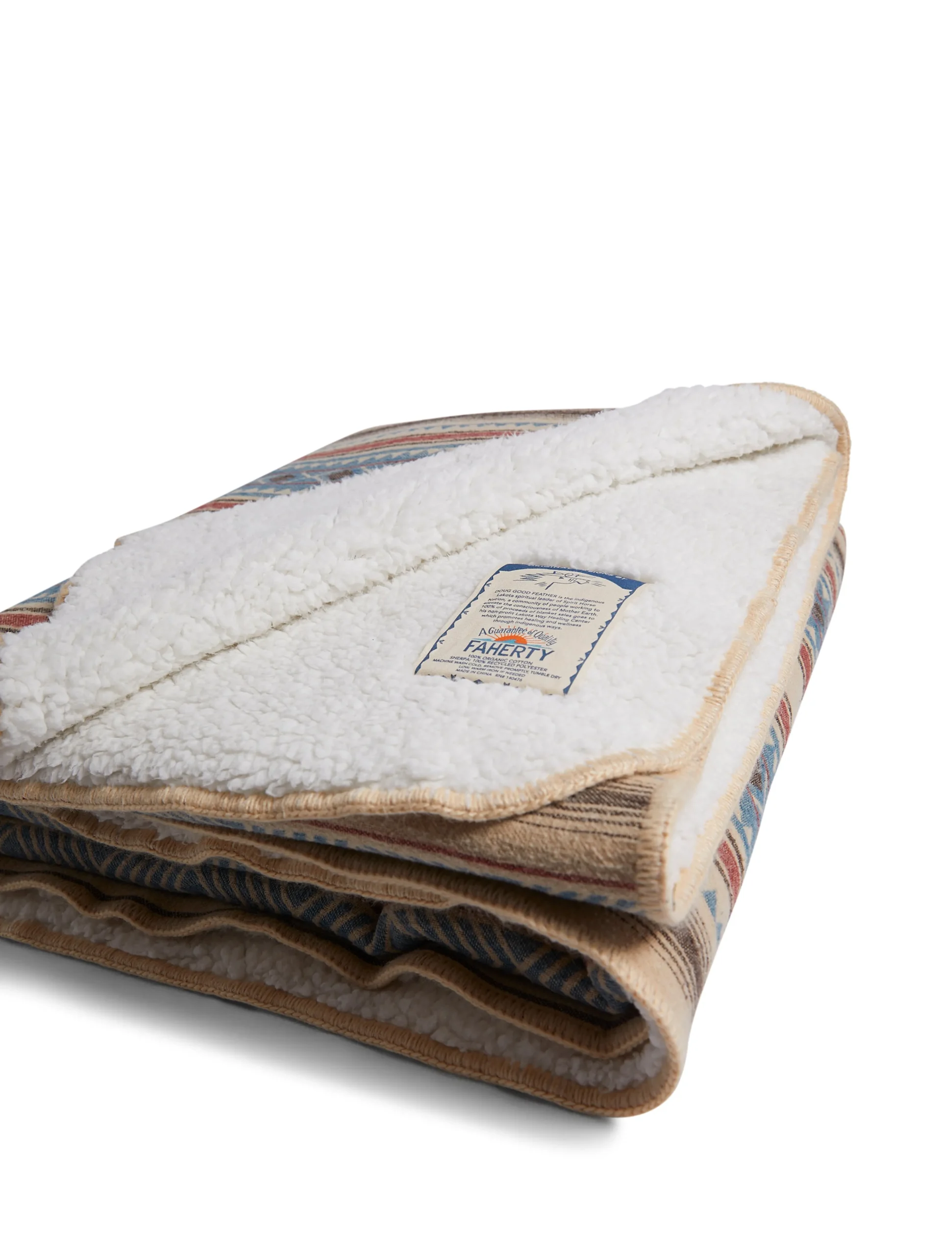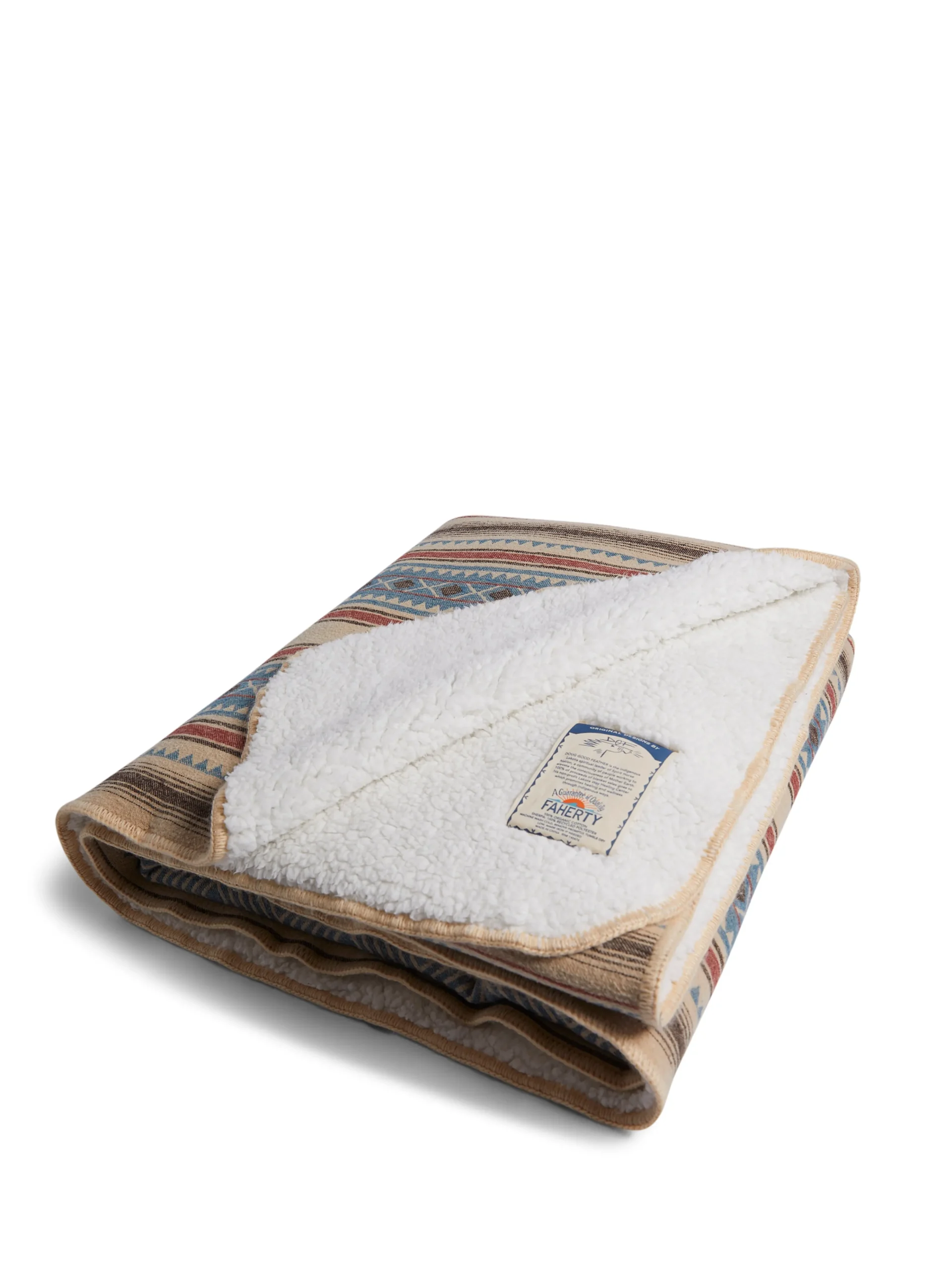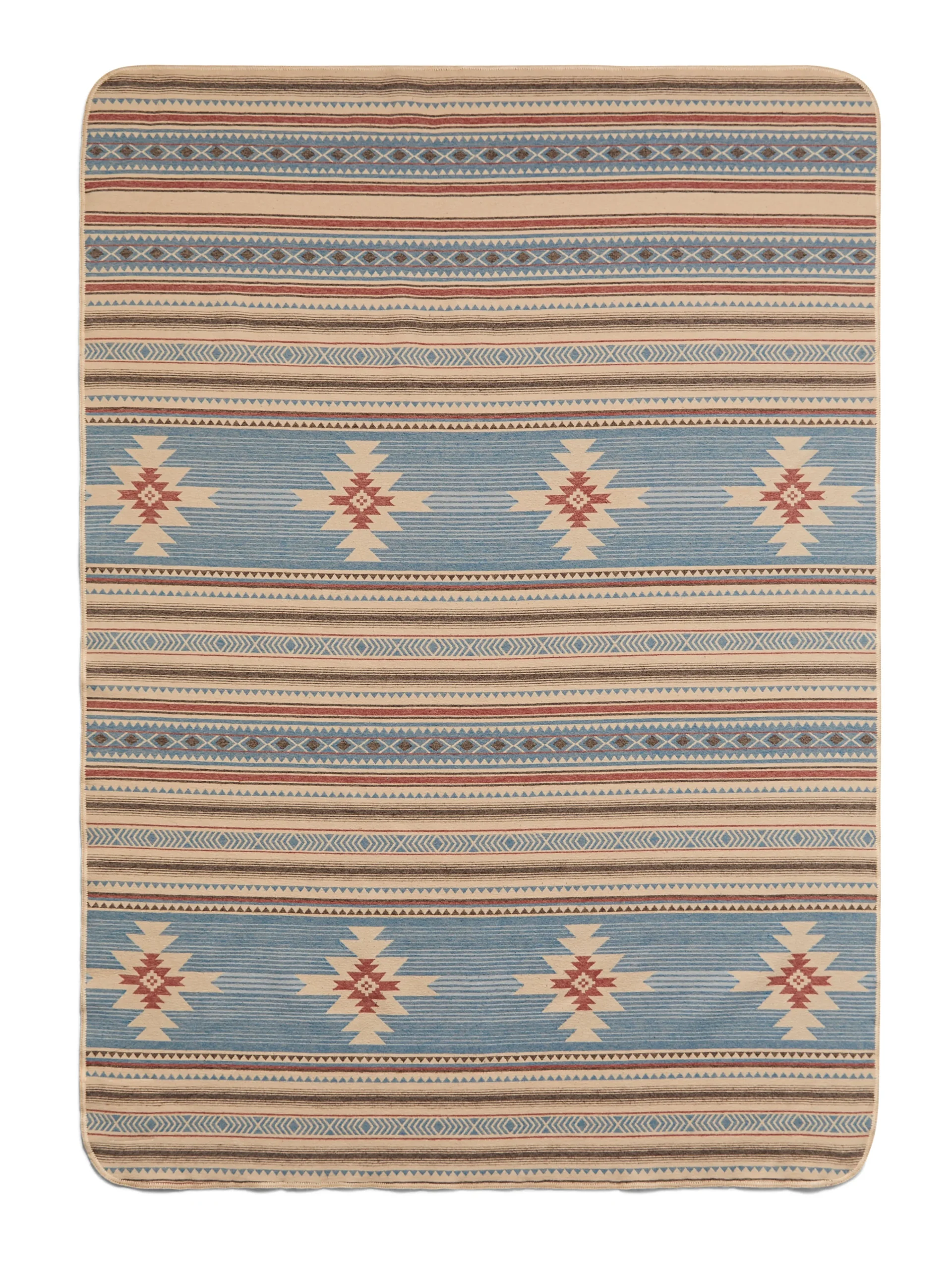 Created in collaboration with Native artist Doug Good Feather, this super cozy blanket features his Prairie Stream design knit in organic cotton on one side and plush high pile fleece on the other. An artist, veteran, author, and teacher, Doug Good Feather is from the Standing Rock Lakota and Dakota Nation and is the founder of the Lakota Way Healing Center. Our ongoing partnership has enabled the Center to purchase 160+ acres of land and expand its ability to offer Indigenous spiritual practices to anyone in need of healing.
