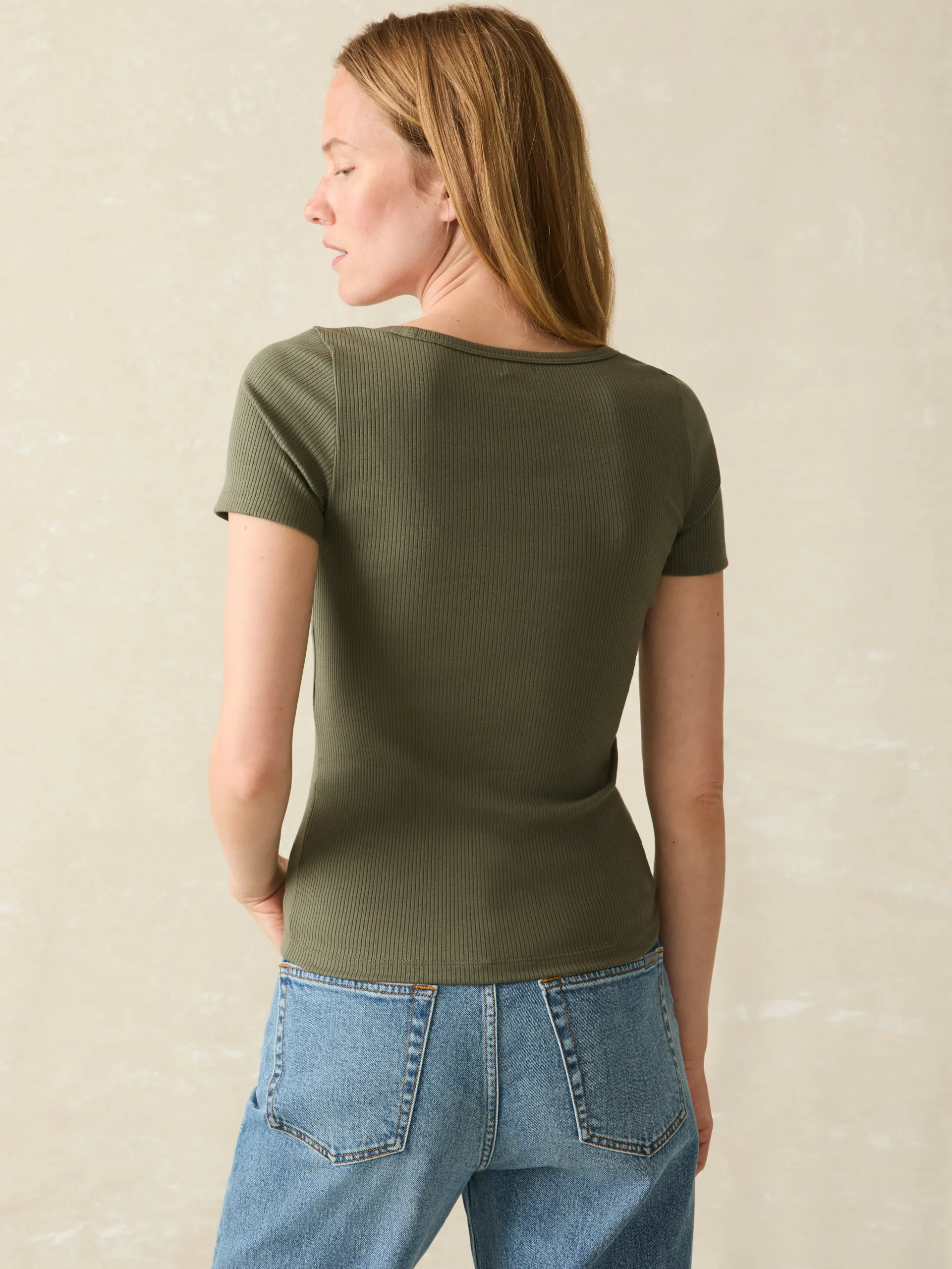 Crafted from our very own premium stretch pima cotton, this tee offers luxurious softness with an effortless fit. The ribbed knit adds subtle texture, transforming a classic wardrobe staple into a stylish piece that works for laid-back outings to more polished occasions all year-round. This is our go-to top for balancing out flowy, maxi skirts and wide-legged pants.