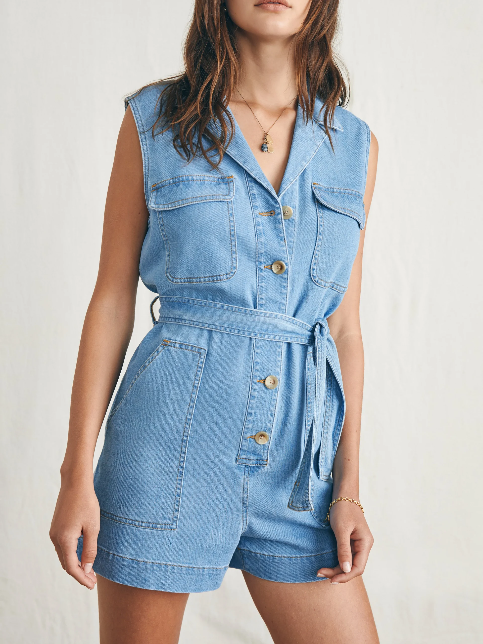 - Detail: Organic cotton and linen blend denim sleeveless romper. Patch pockets at the front chest and bottom, welt pocket at the back. Removable self-fabric belt. Light indigo denim wash.