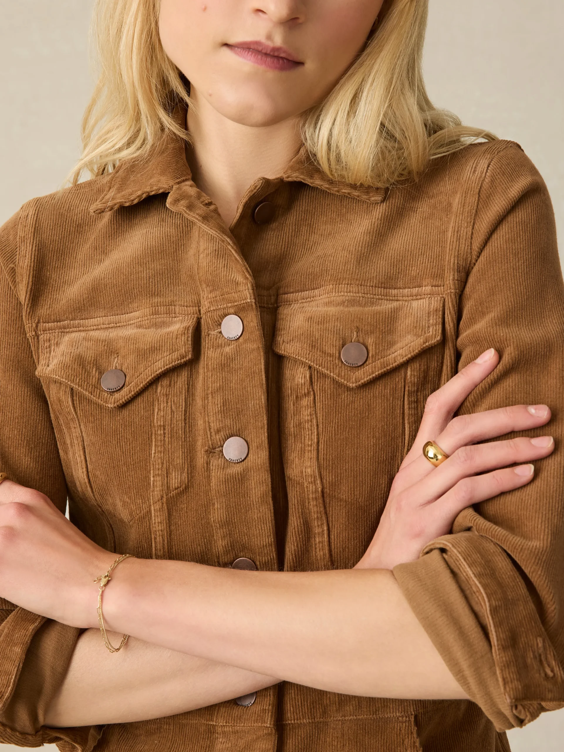 - Material: 97% Organic Cotton, 3% Elastane, Faherty Text simple shank buttons