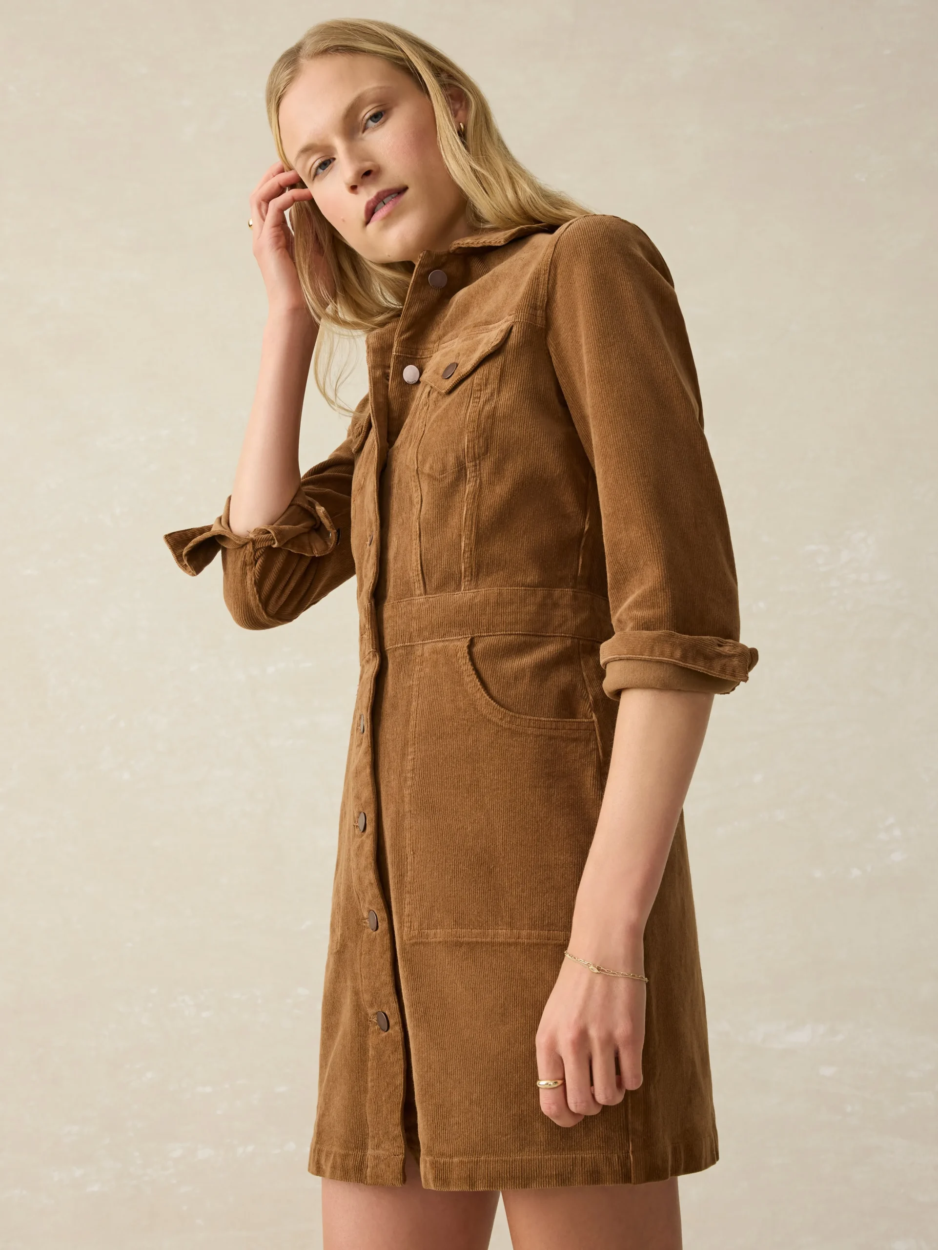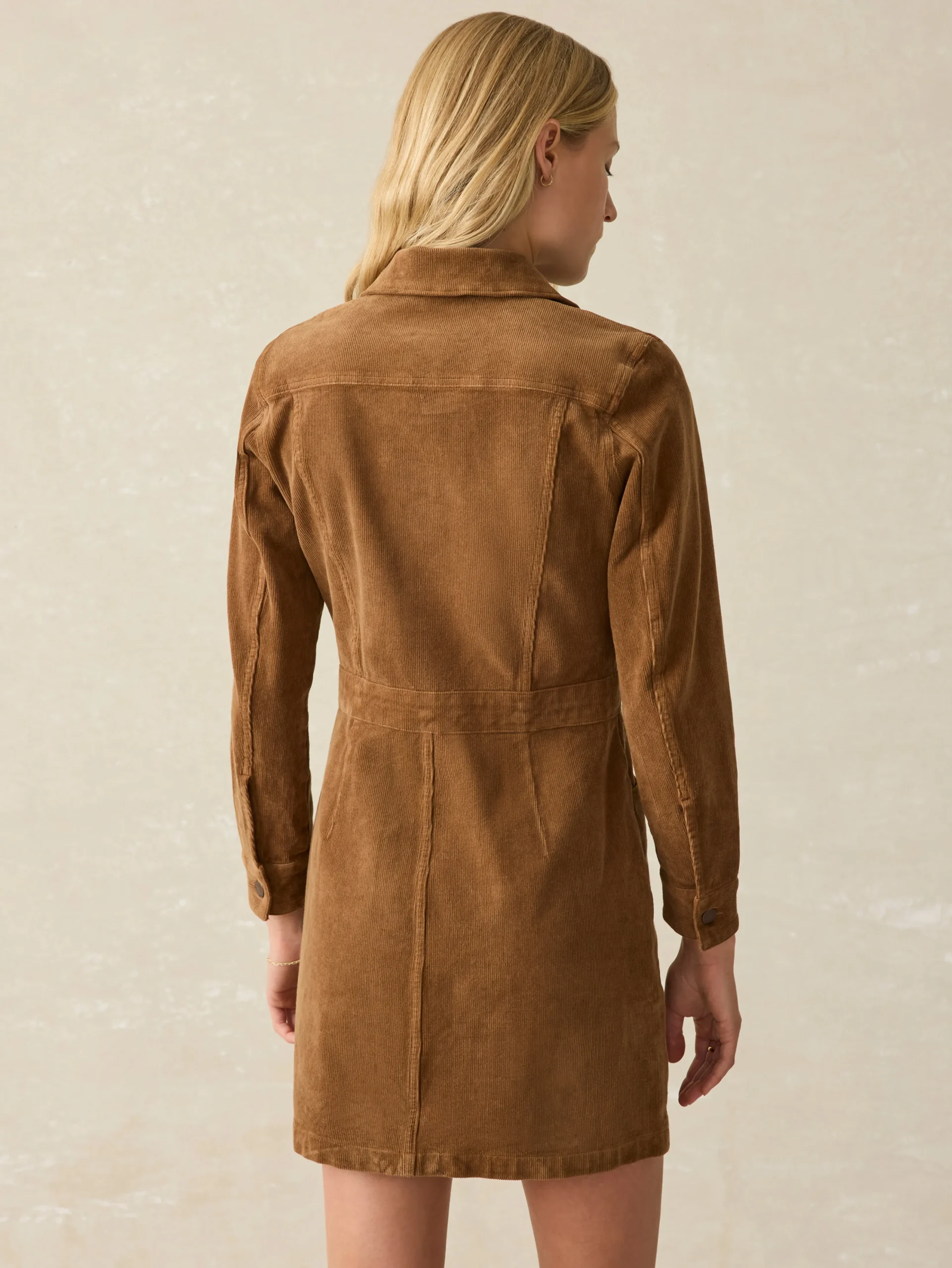 We took the details and feel of our most treasured, well-worn denim jacket and added a bit of length to the silhouette to create this utilitarian-inspired dress. Made in a soft, 4-way stretch corduroy, the elevated texture hugs every curve — in the best of ways.