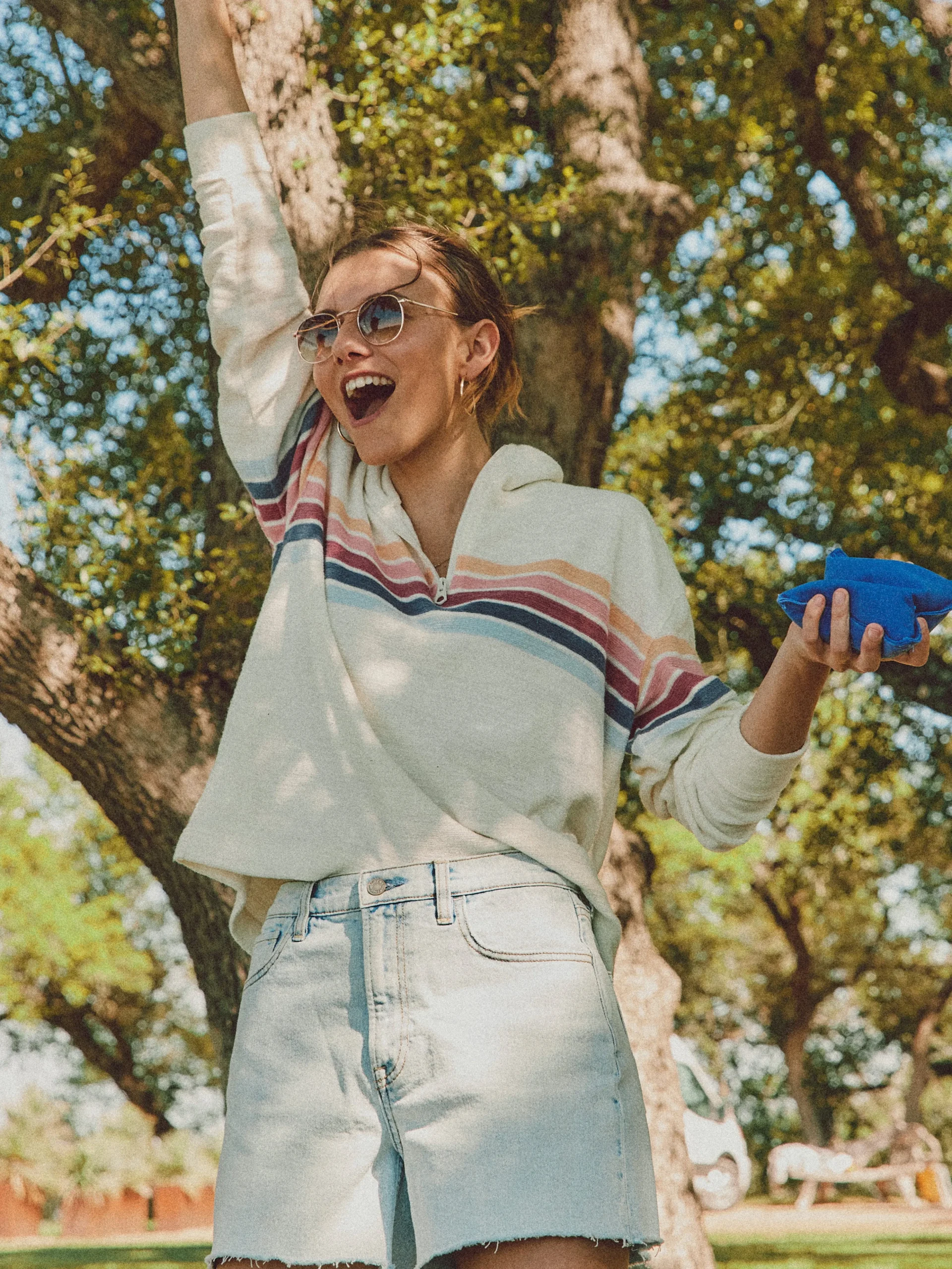 Meet your new go-to layer for lazy weekends and chilling post-waves. Our cozy, toweling terrycloth quarter zip channels ultimate vintage beach vibes with nautical-inspired colorblocking and a classic sporty silhouette. Fun and relaxed, just like summer should be.
