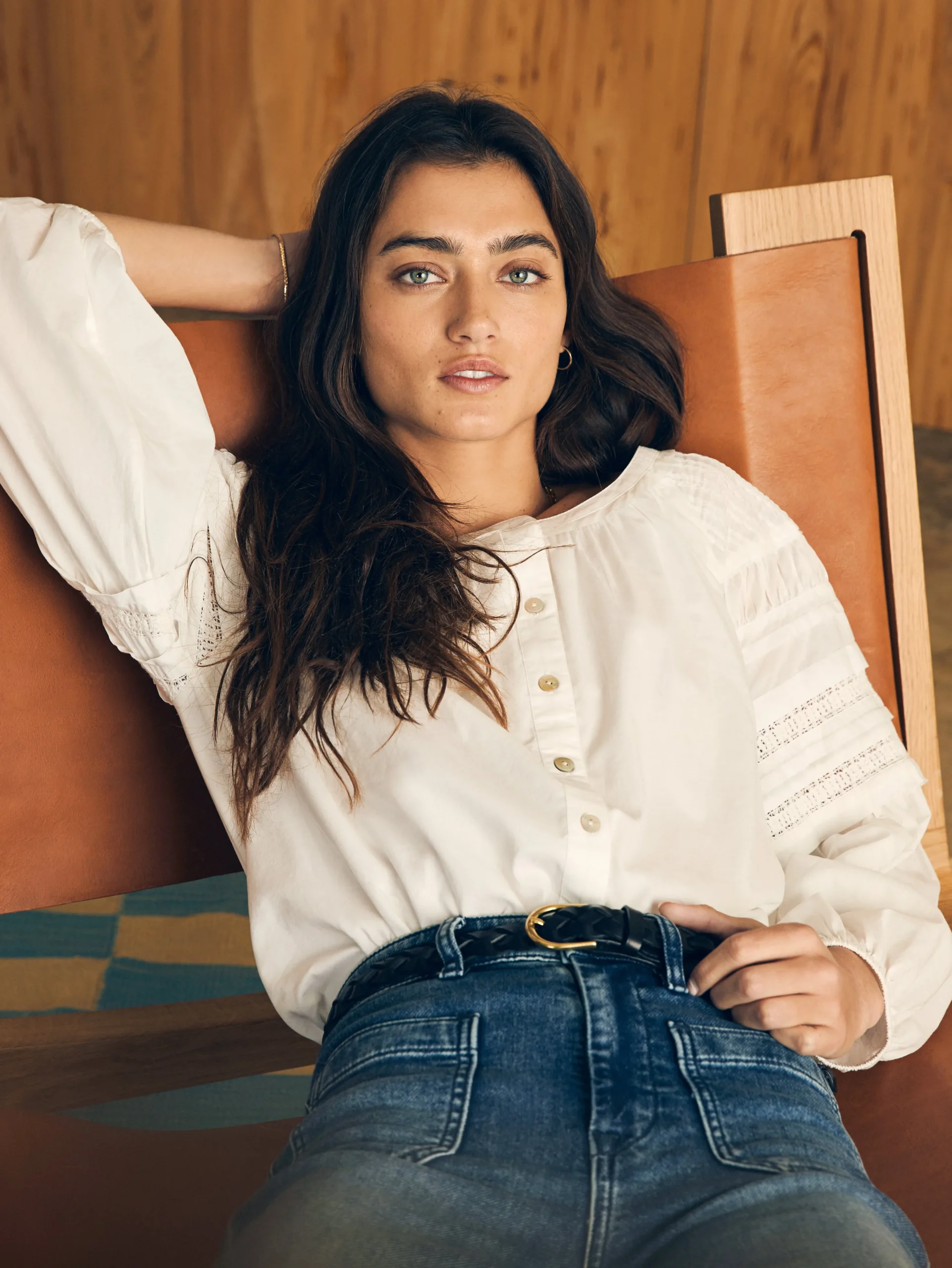 The Enna is made for dreamy mornings, for strolls down the street, for sunny afternoons in the park — for the best days, really. The soft organic cotton sets the stage for intricate details: pintuck shirring, lace details, billowy sleeves, and delicate shell buttons. The beautifully draped fit hits at the top of the hip, for a look that’s all effortless charm.