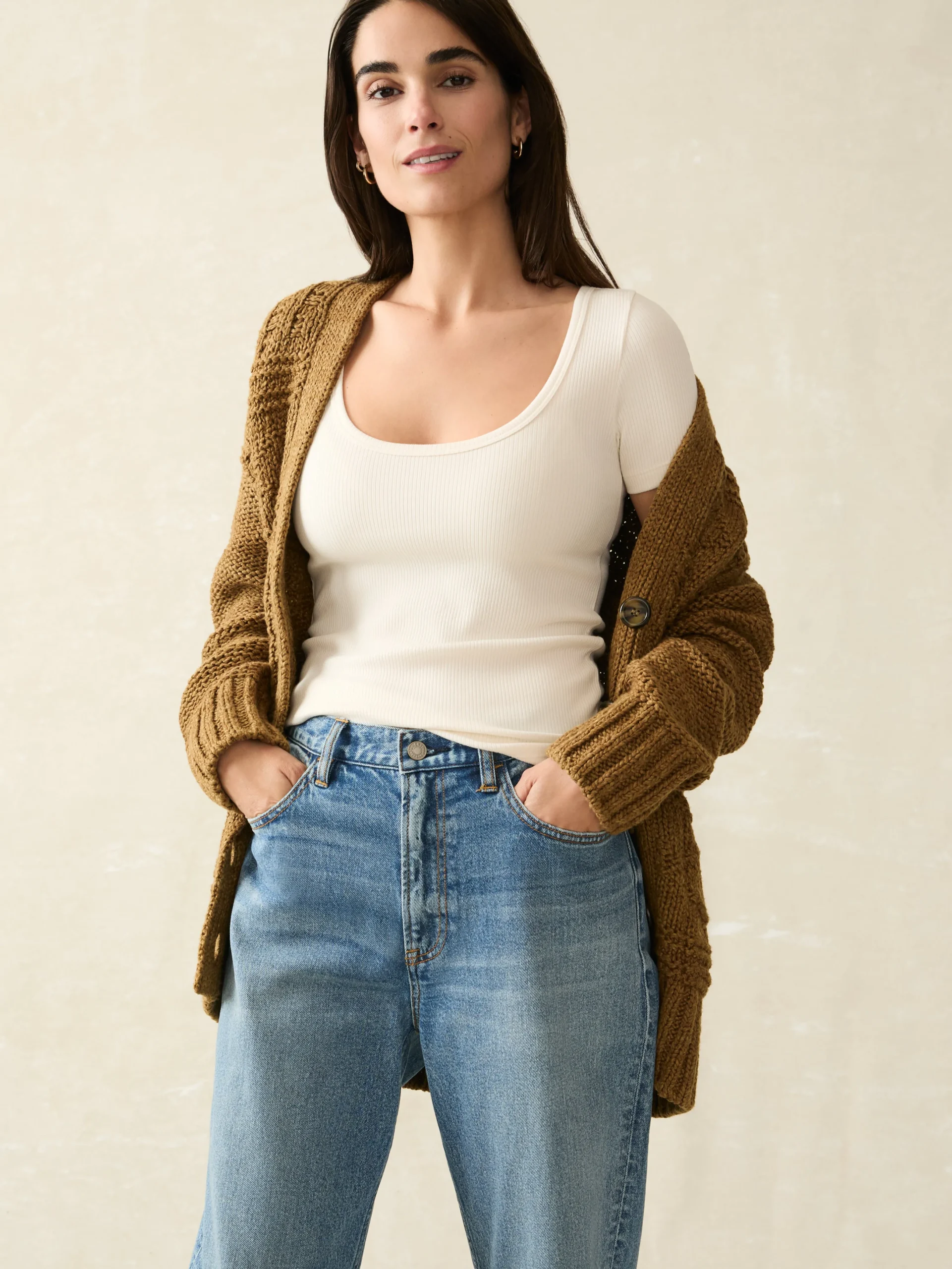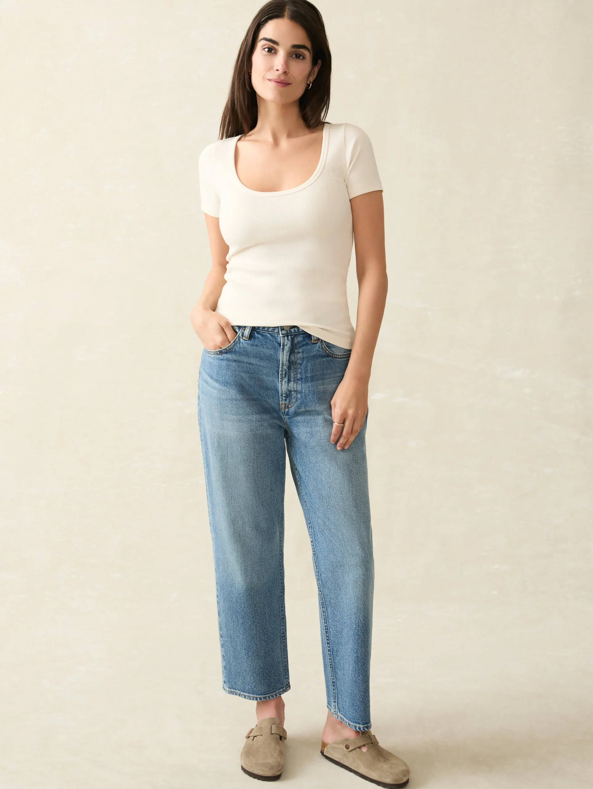 Crafted from our very own premium stretch pima cotton, this tee offers luxurious softness with an effortless fit. The ribbed knit adds subtle texture, transforming a classic wardrobe staple into a stylish piece that works for laid-back outings to more polished occasions all year-round. This is our go-to top for balancing out flowy, maxi skirts and wide-legged pants.