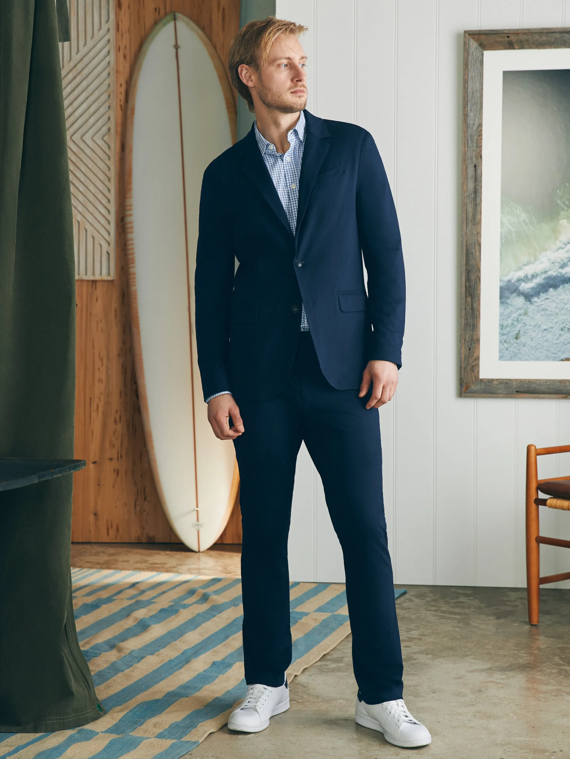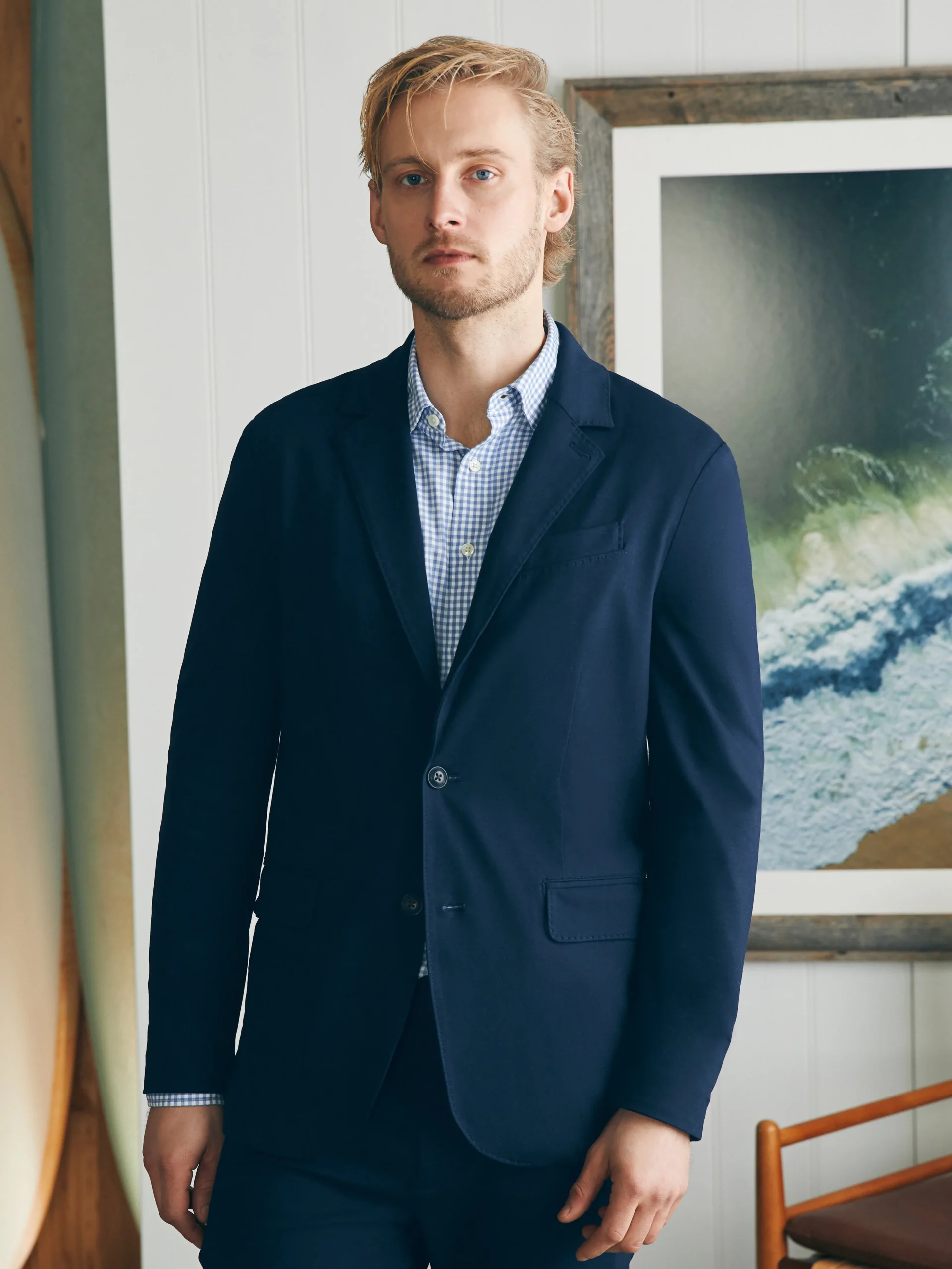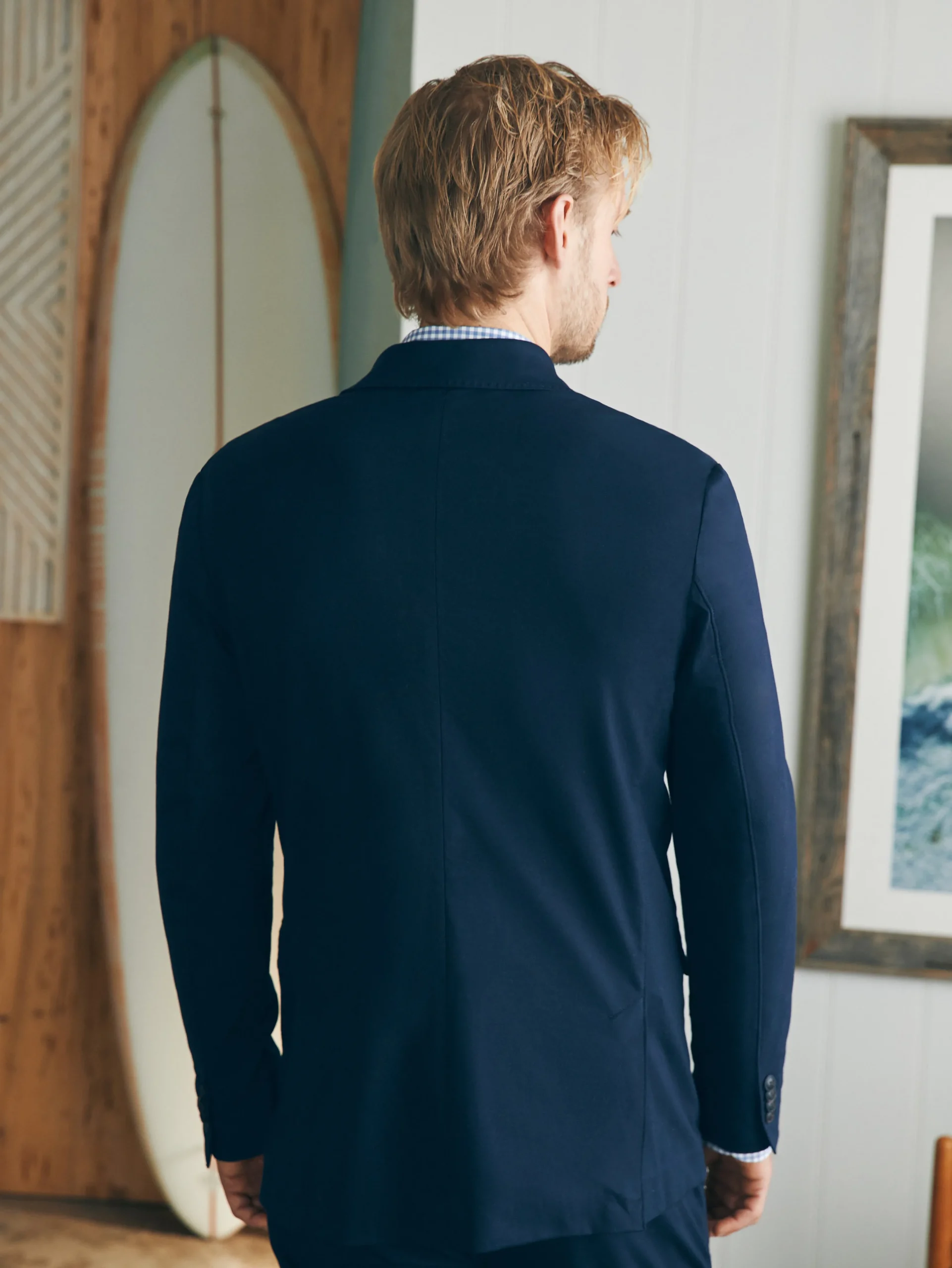 - Fit: Slim fit. Two-button blazer. Double vented back.