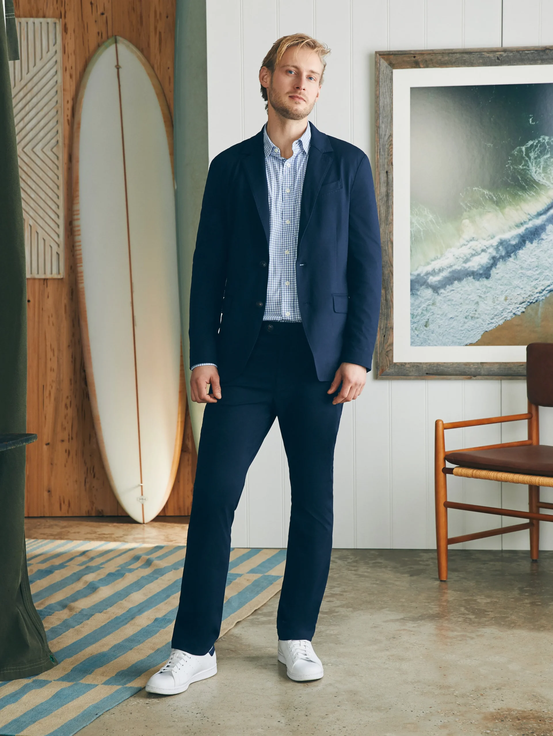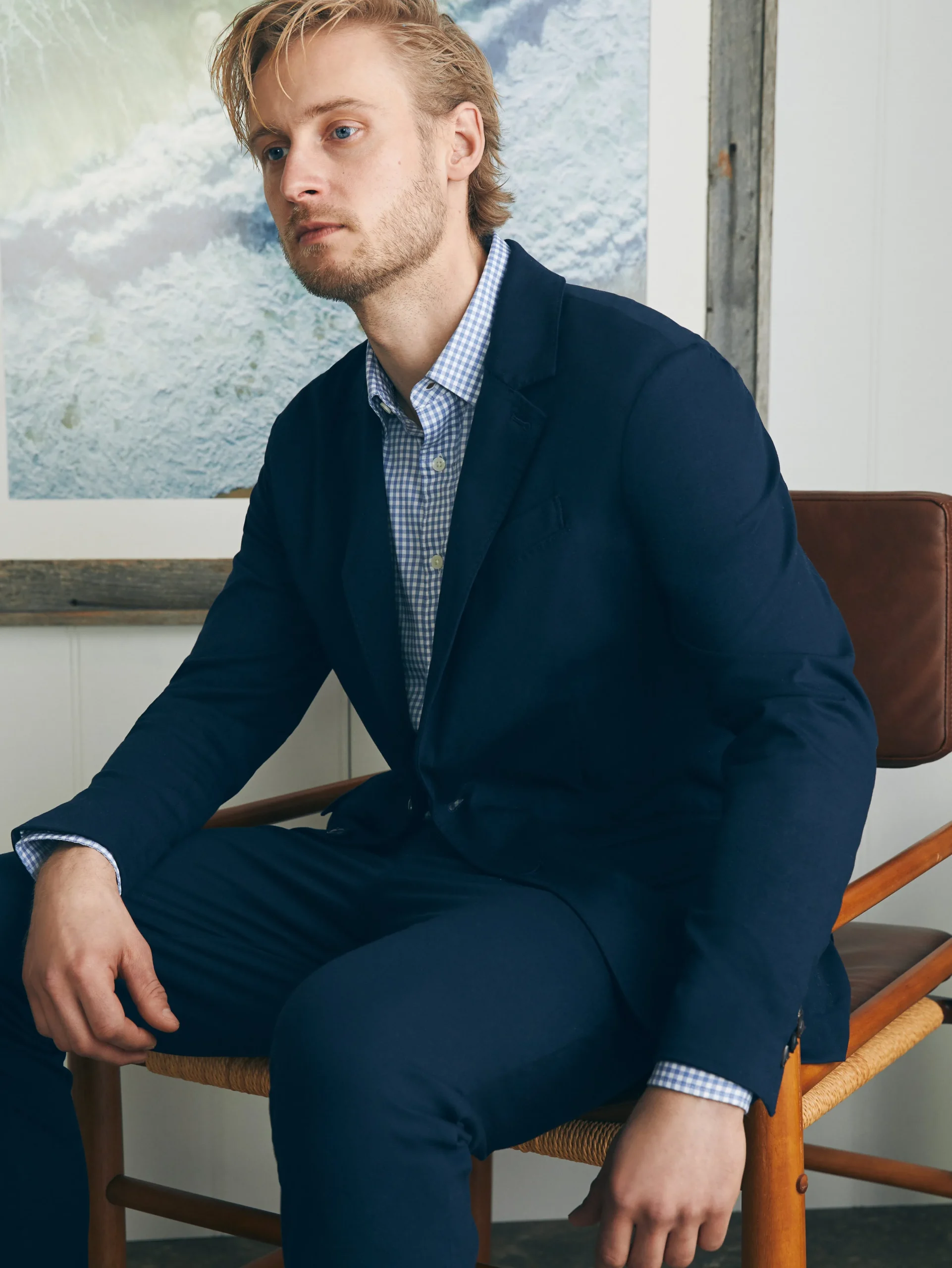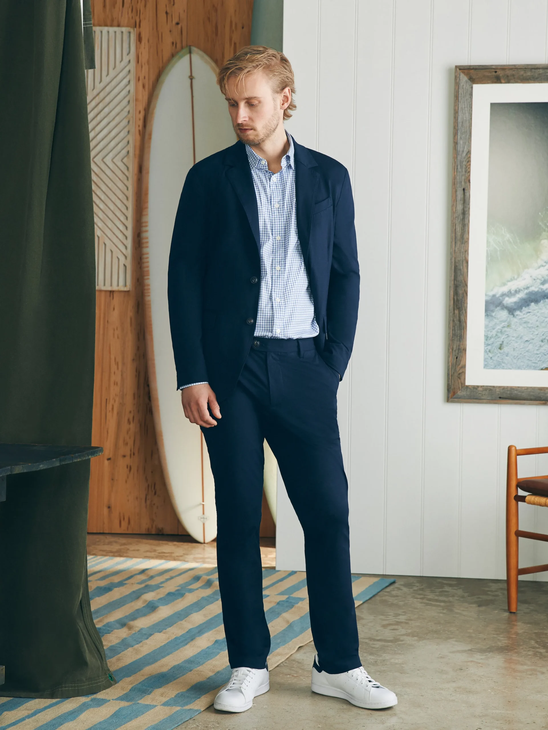 - Fit: Slim fit. Two-button blazer. Double vented back.