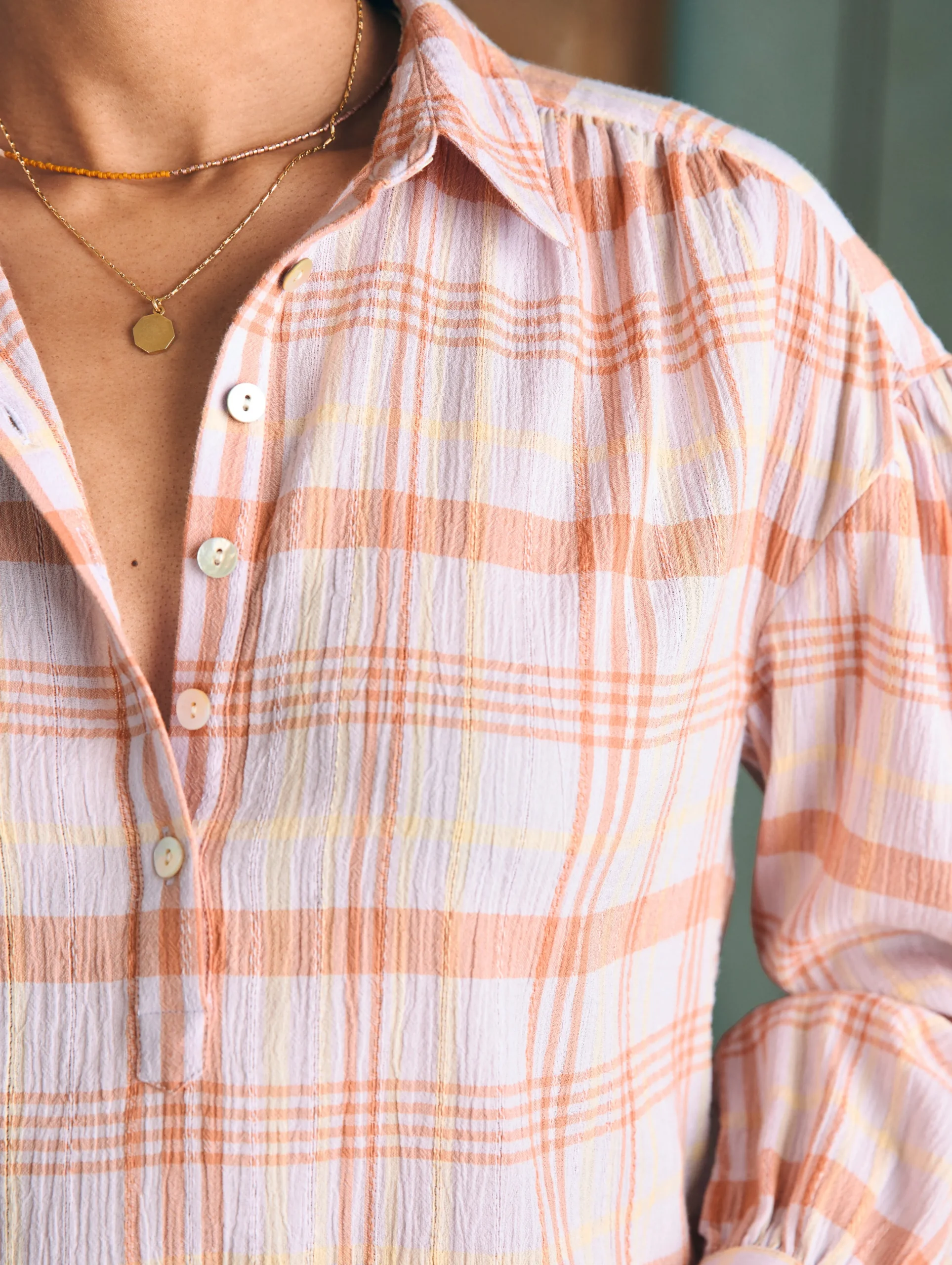 - Detail: Half placket and cuffs with shell buttons. Shirring along front and back yoke. Shirttail hem with gusset.