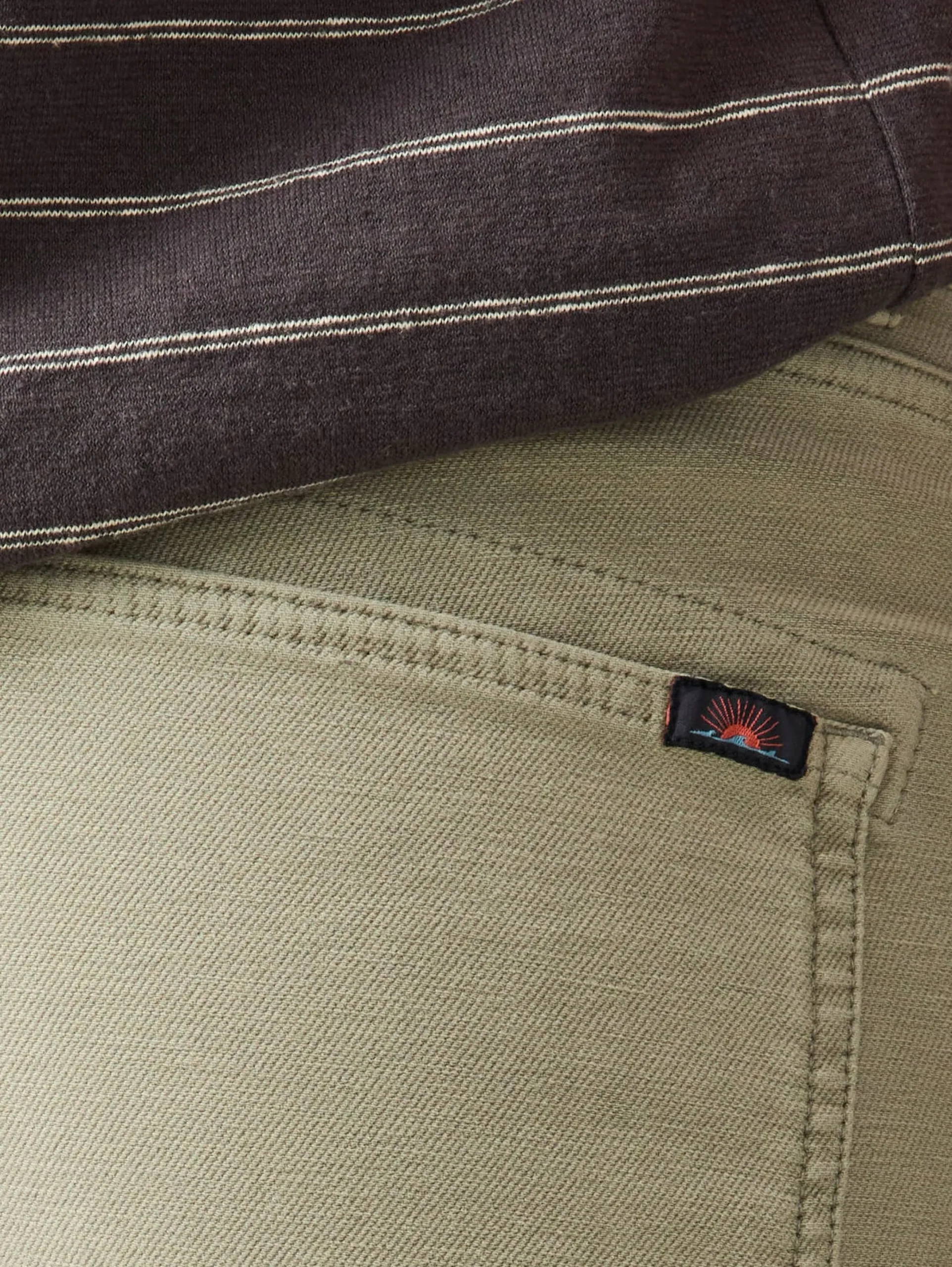 - Detail: Belt loops. Classic 5-pocket styling. Metal Rivets for pocket reinforcements. Metal fly zipper. Faherty logo back patch at wearer’s right.