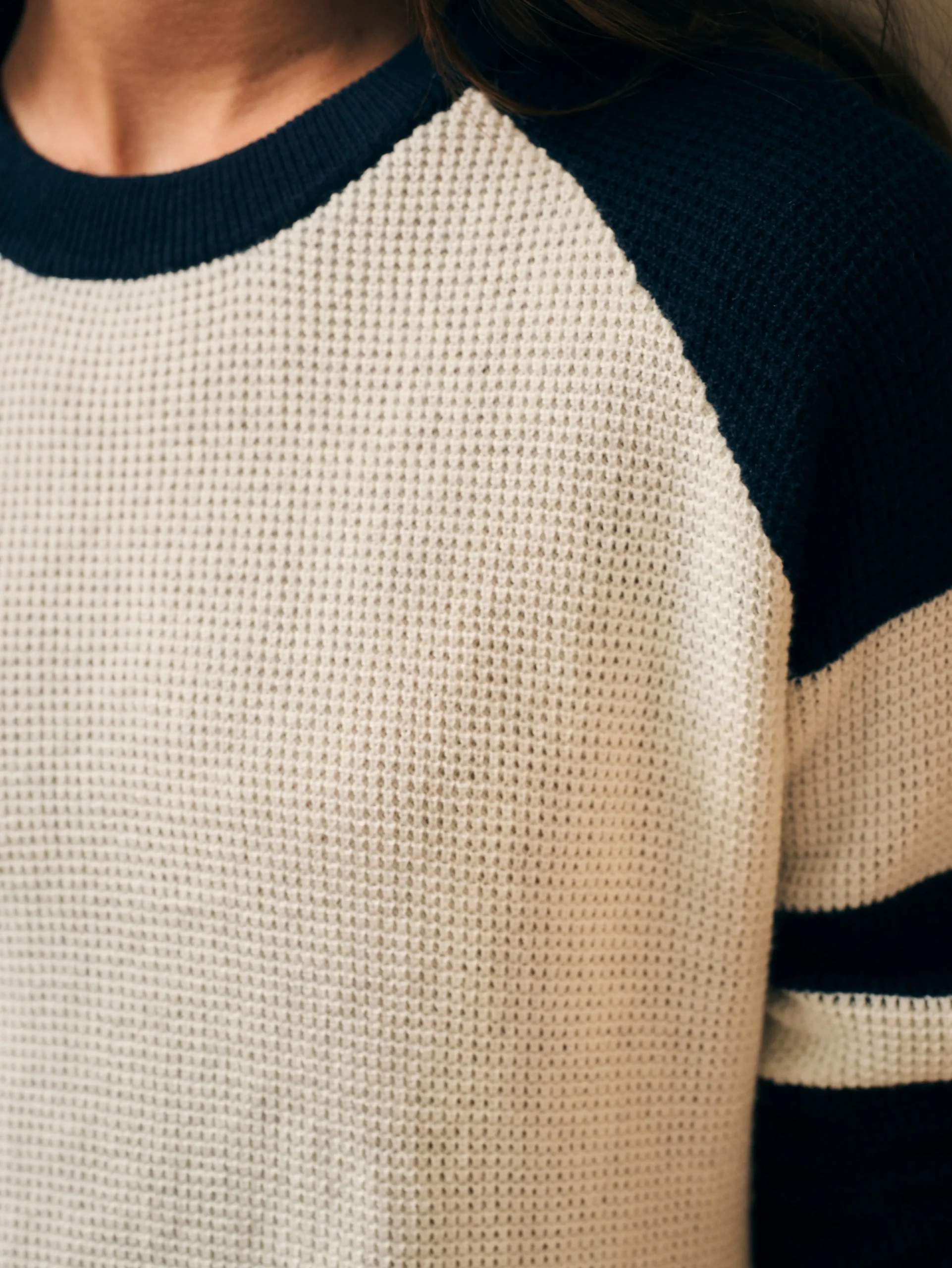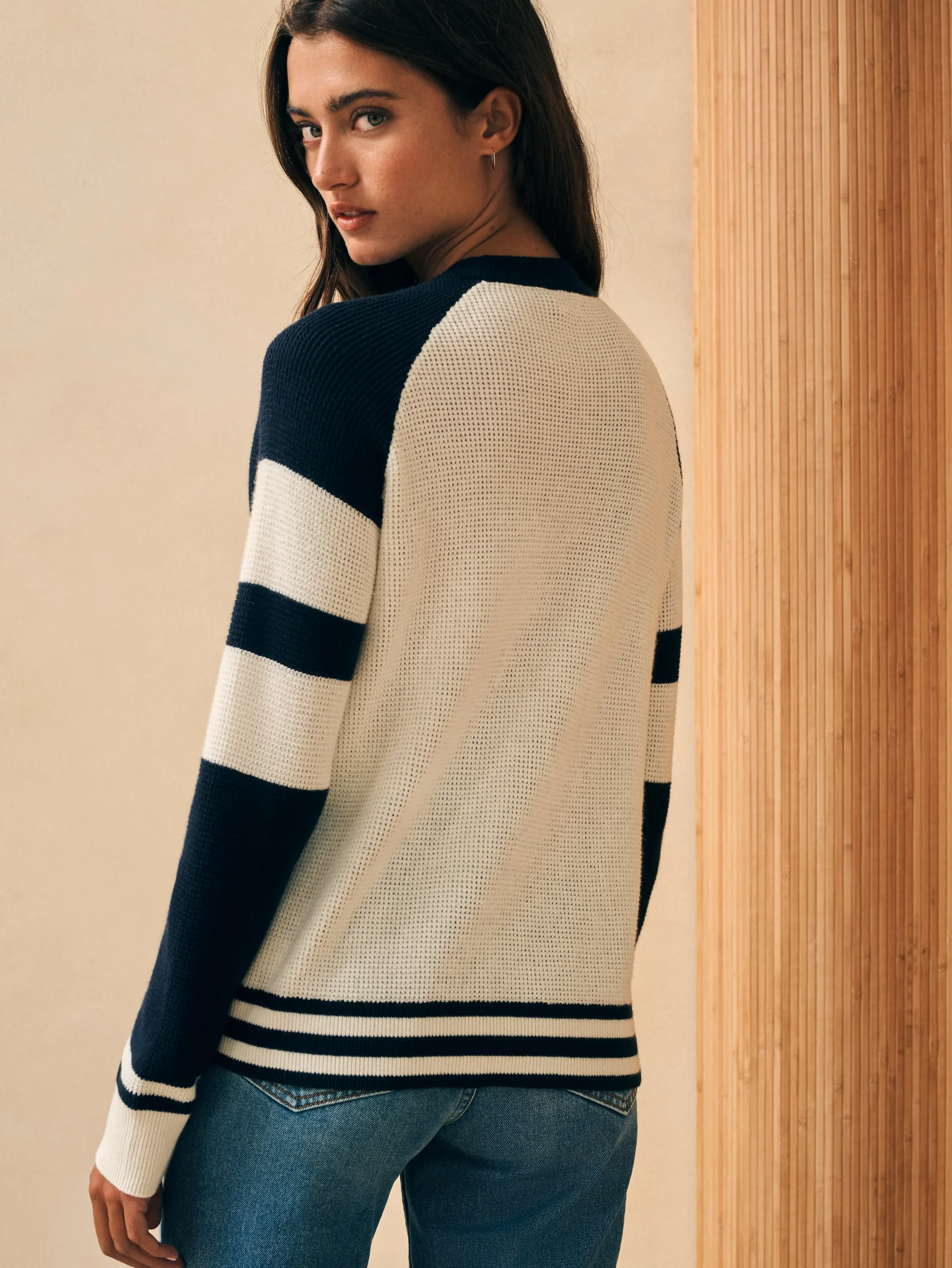 With a nod to nostalgic collegiate sportswear, this classic crewneck gets an elevated update in the softest organic cotton and cashmere yarn. The wonderfully textured waffle stitch lays with a relaxed, no-fuss fit that keeps you toasty and comfy. Play up the sporty stripes and playful colorblocking with jeans or a corduroy skirt for a quintessential fall look.