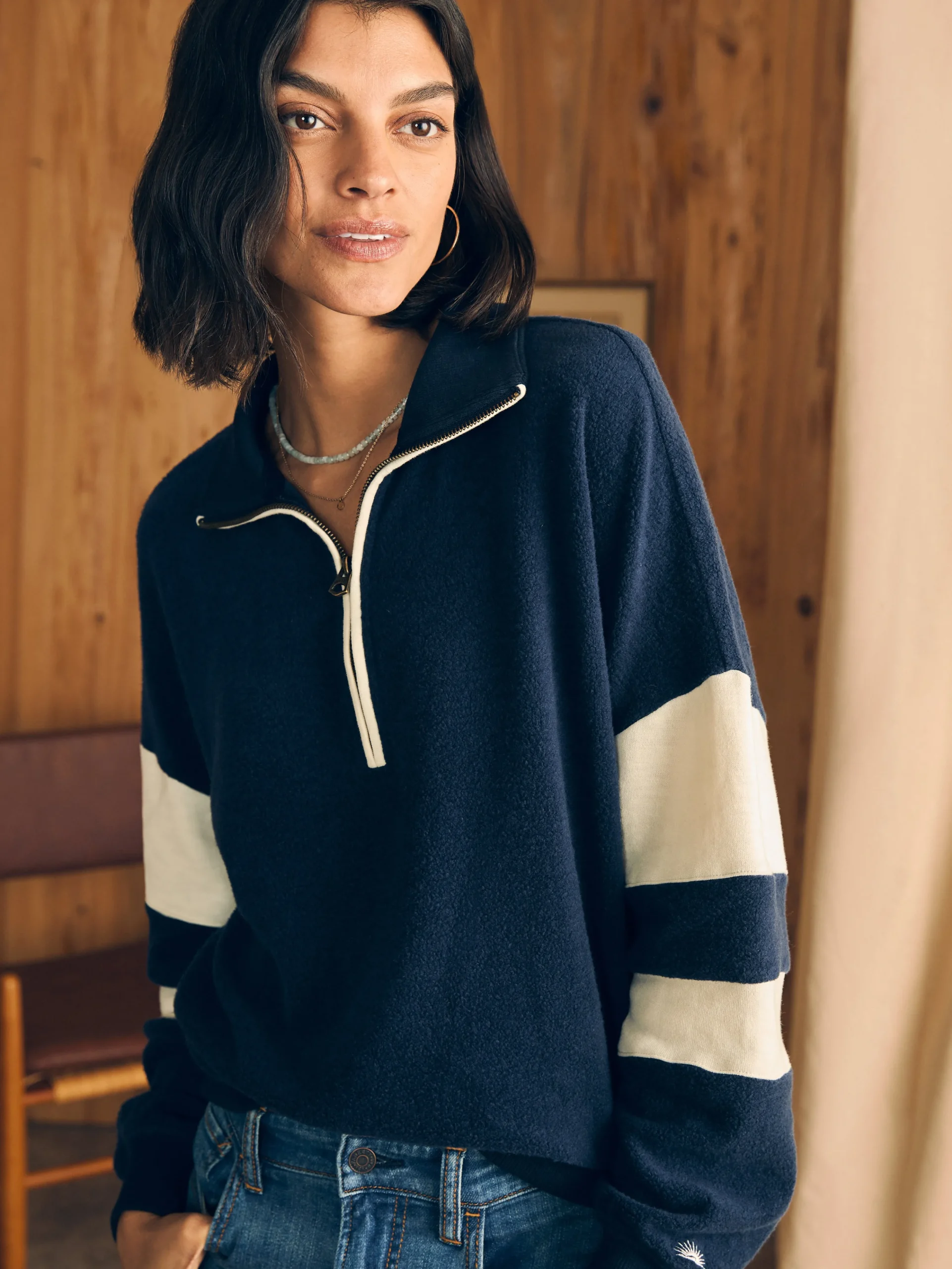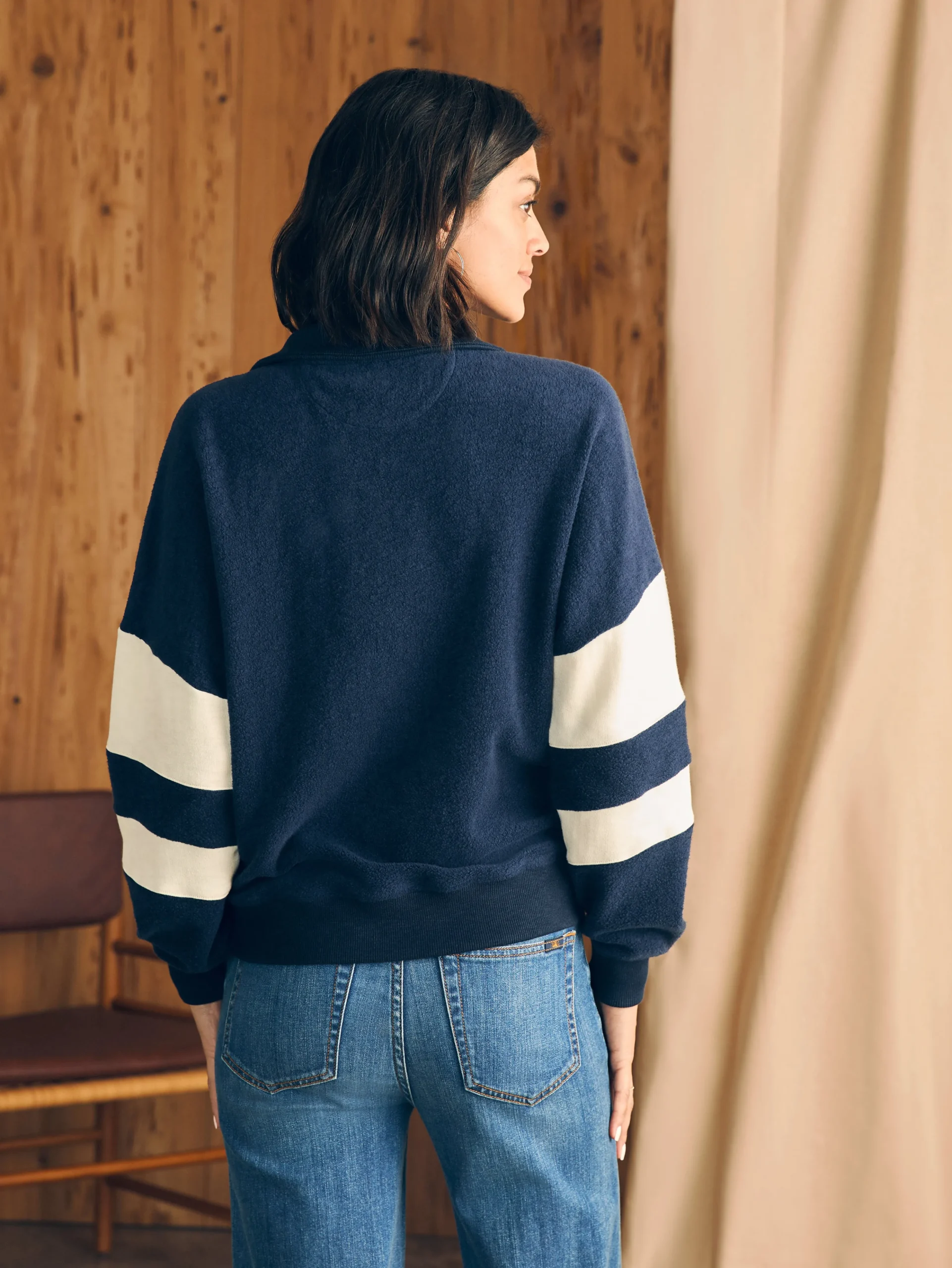 We took our favorite sweatshirt, flipped it inside out and never looked back. Made from an irresistibly soft and textured brushed terry, this relaxed quarter zip sports a washed vintage graphic inspired by the surf towns we grew up visiting with our family and friends. It’s our go-to layer post waves.