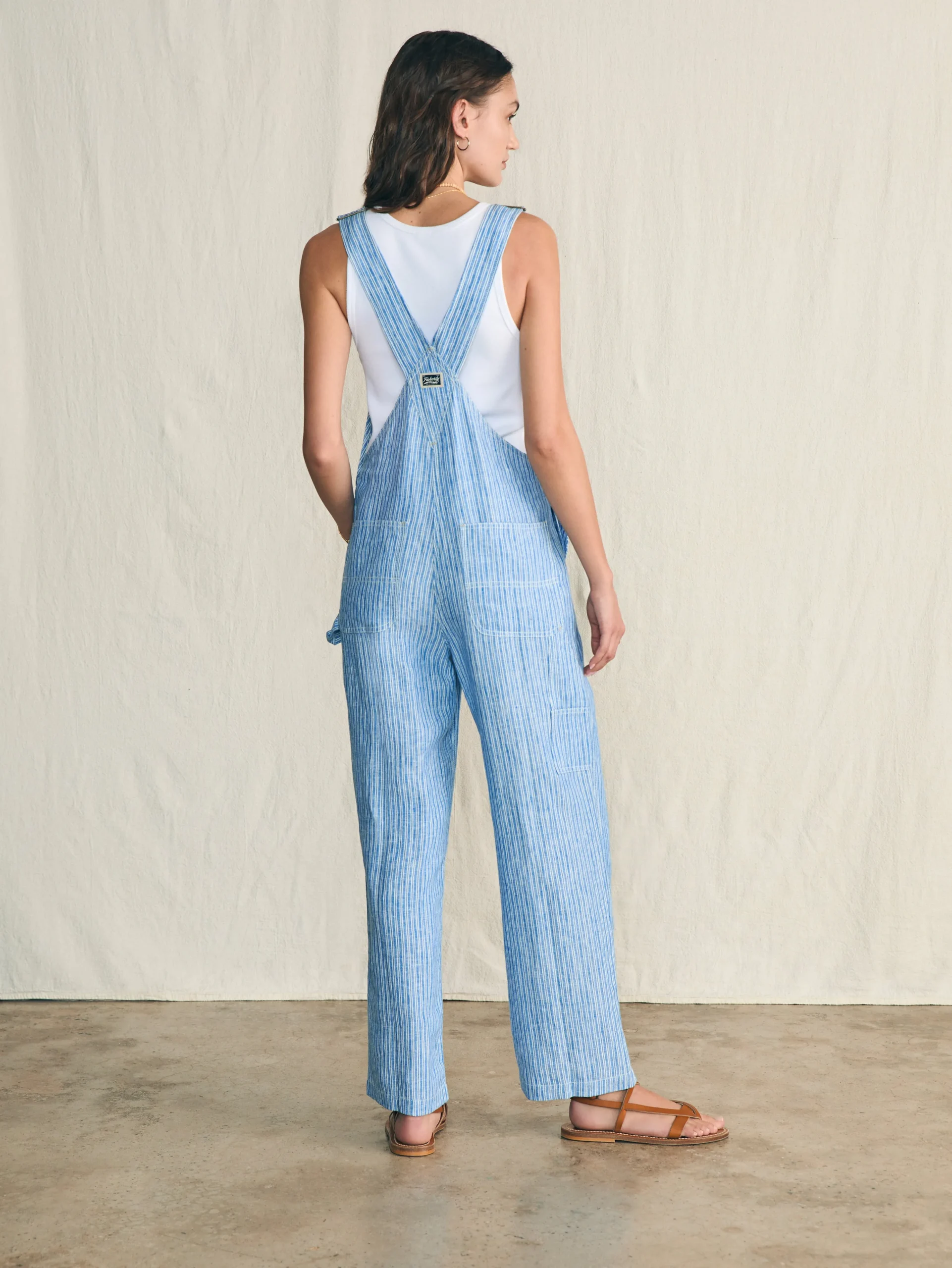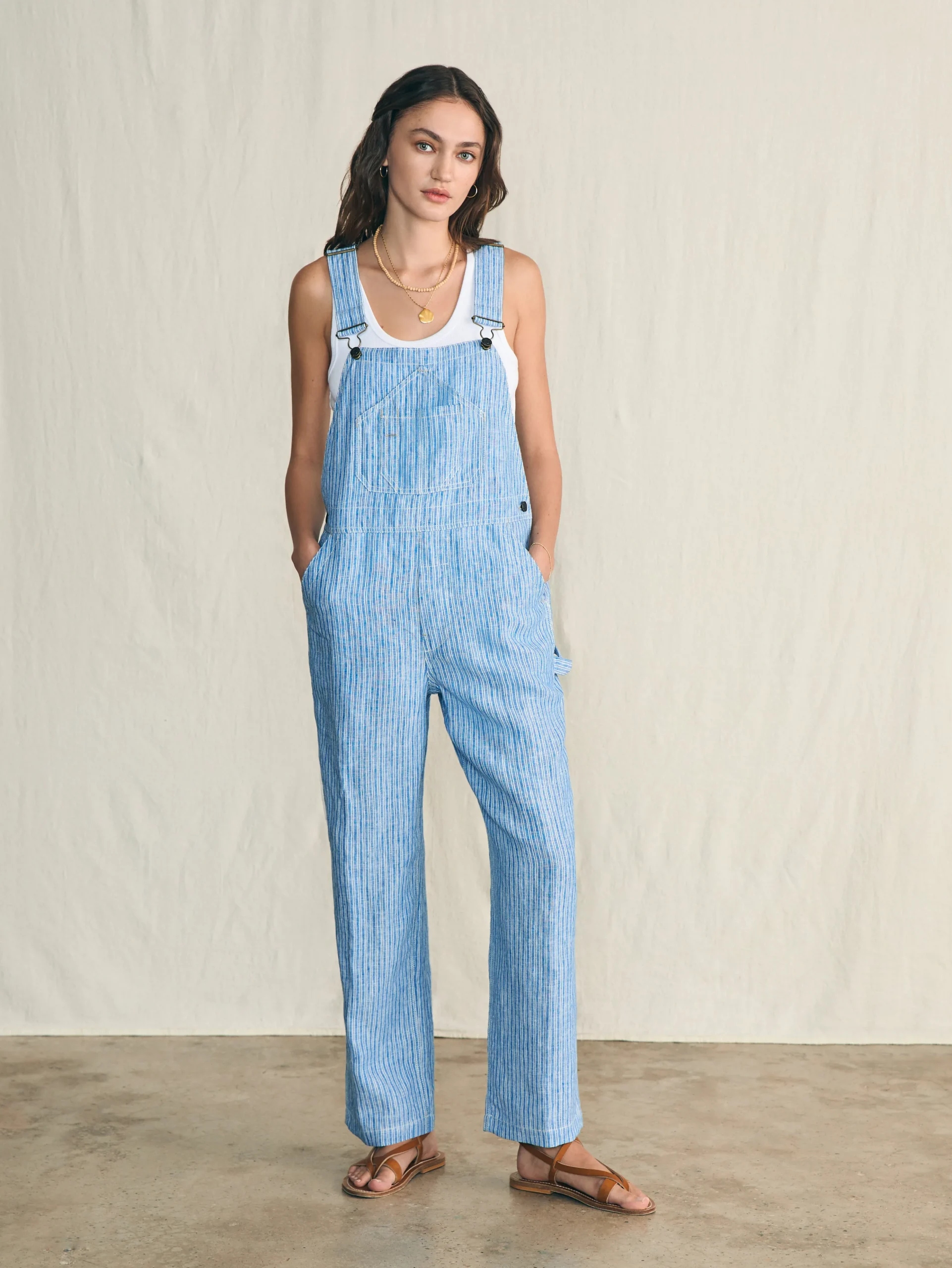 - Detail: Stripe Linen Overall with antique brass metal buckle closure at the shoulder straps