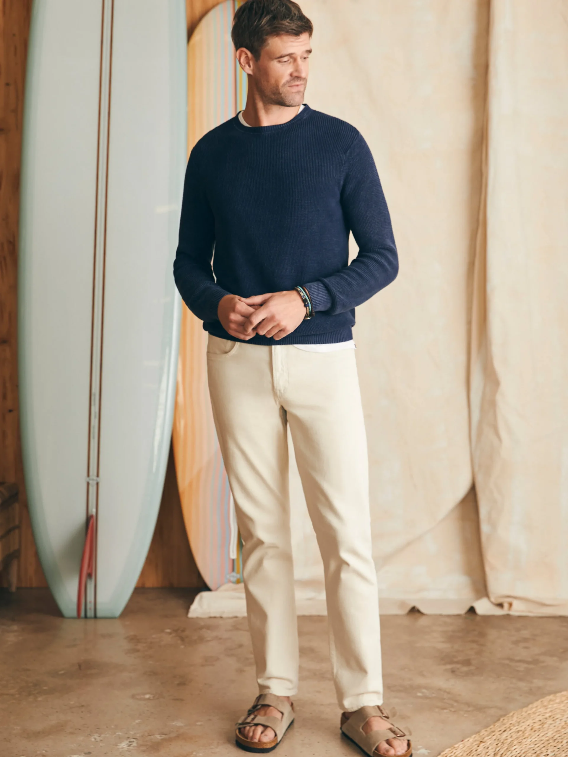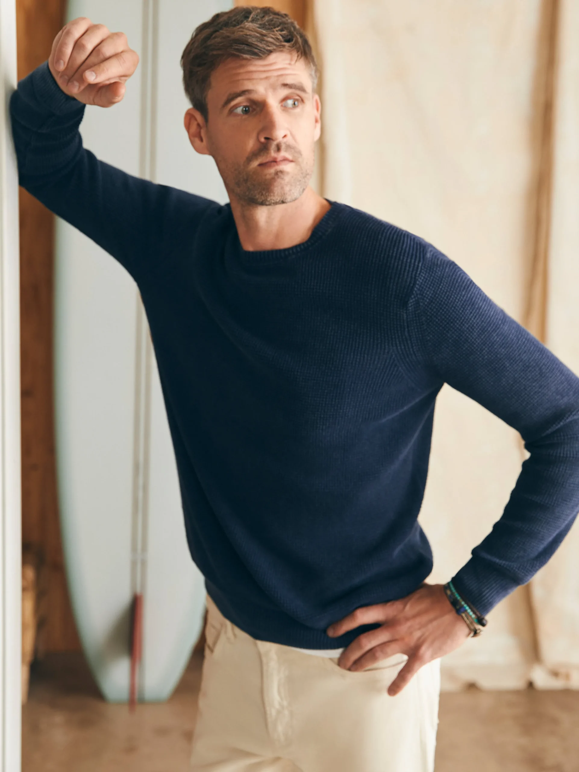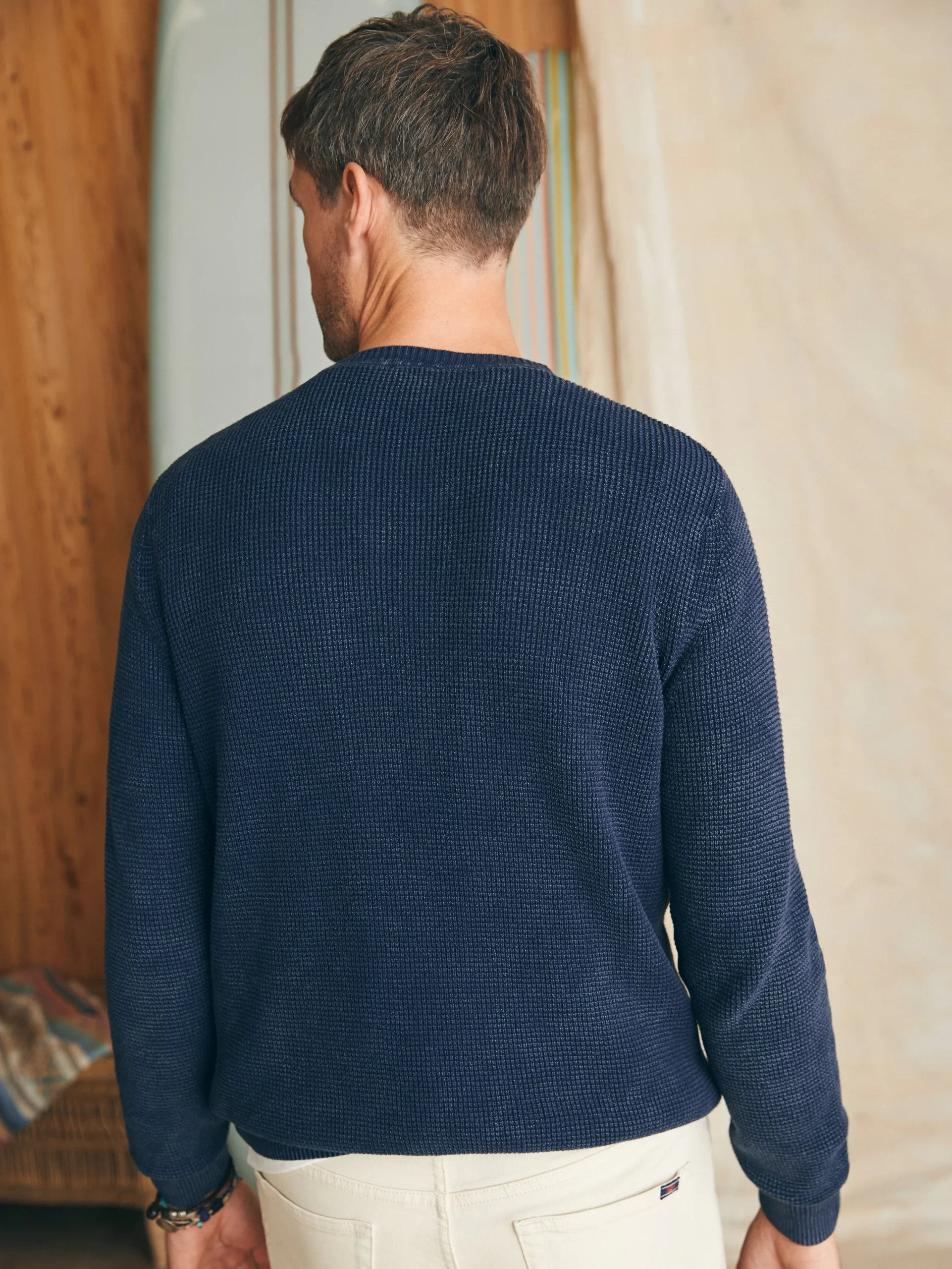 Designed as an easy to wear, transitional sweater., this will be your go-to year-round crew. Our cotton yarn is super soft but not overly warm and knit in an airy, waffle stitch giving the sweater dimension and texture. It’s then garment-dyed and washed for a lived in, vintage look and feel that’s casually cool for any occasion.