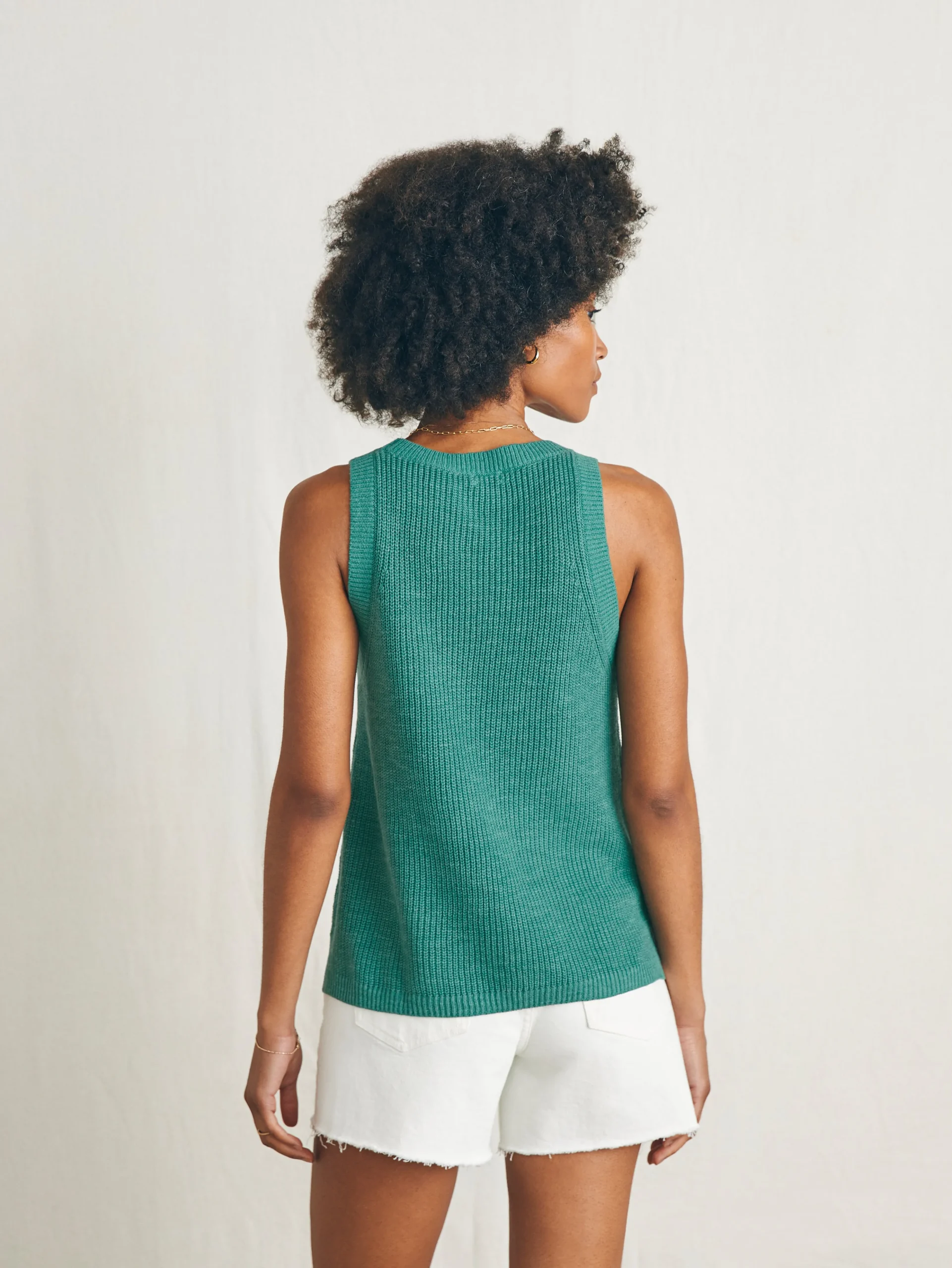 - Detail: Loosely-knit half cardigan stitch. Sleeveless tank, scoop neckline, rib trim detailing. High low hem with side slits.