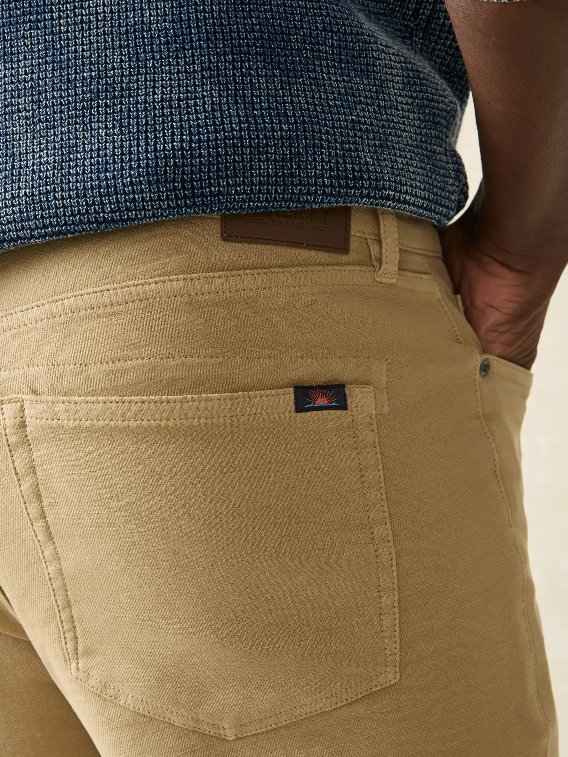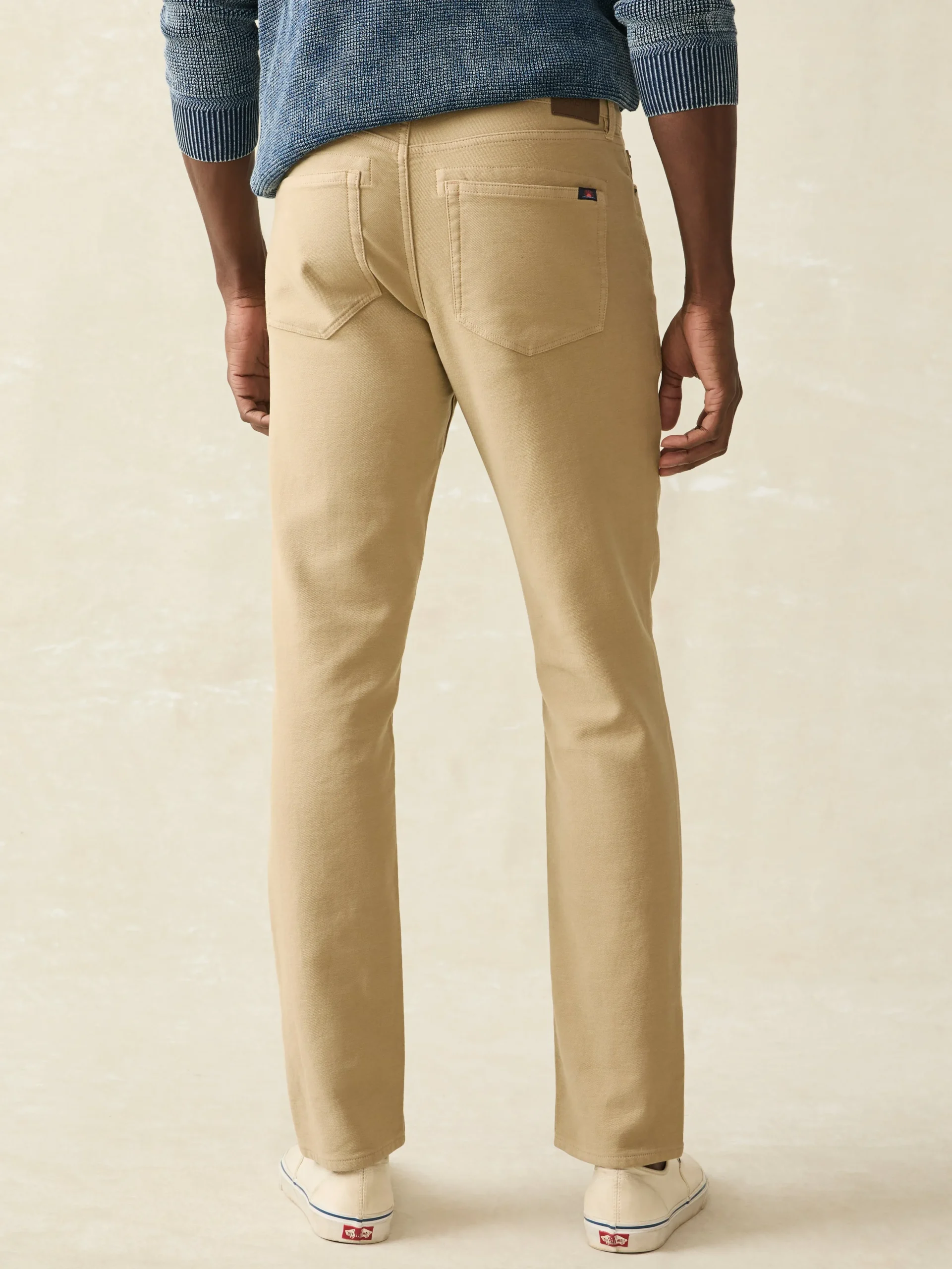 - Detail: Belt loops. Classic 5-pocket styling. Metal Rivets for pocket reinforcements. Metal fly zipper. Faherty logo back patch at wearer’s right.
