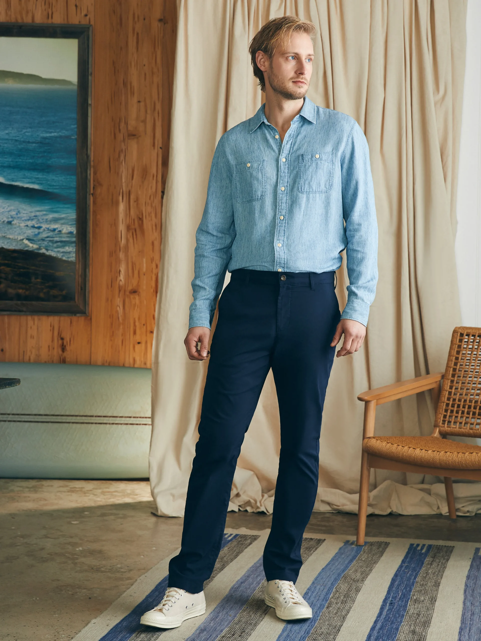 - Detail:Faherty branded metal shank closure. Zipper fly. Zipper closure atthe wearer’s rightback welt pocket. Button closure at the wearer’s back welt pocket. Elastic interior waistband for added comfort and a better fit