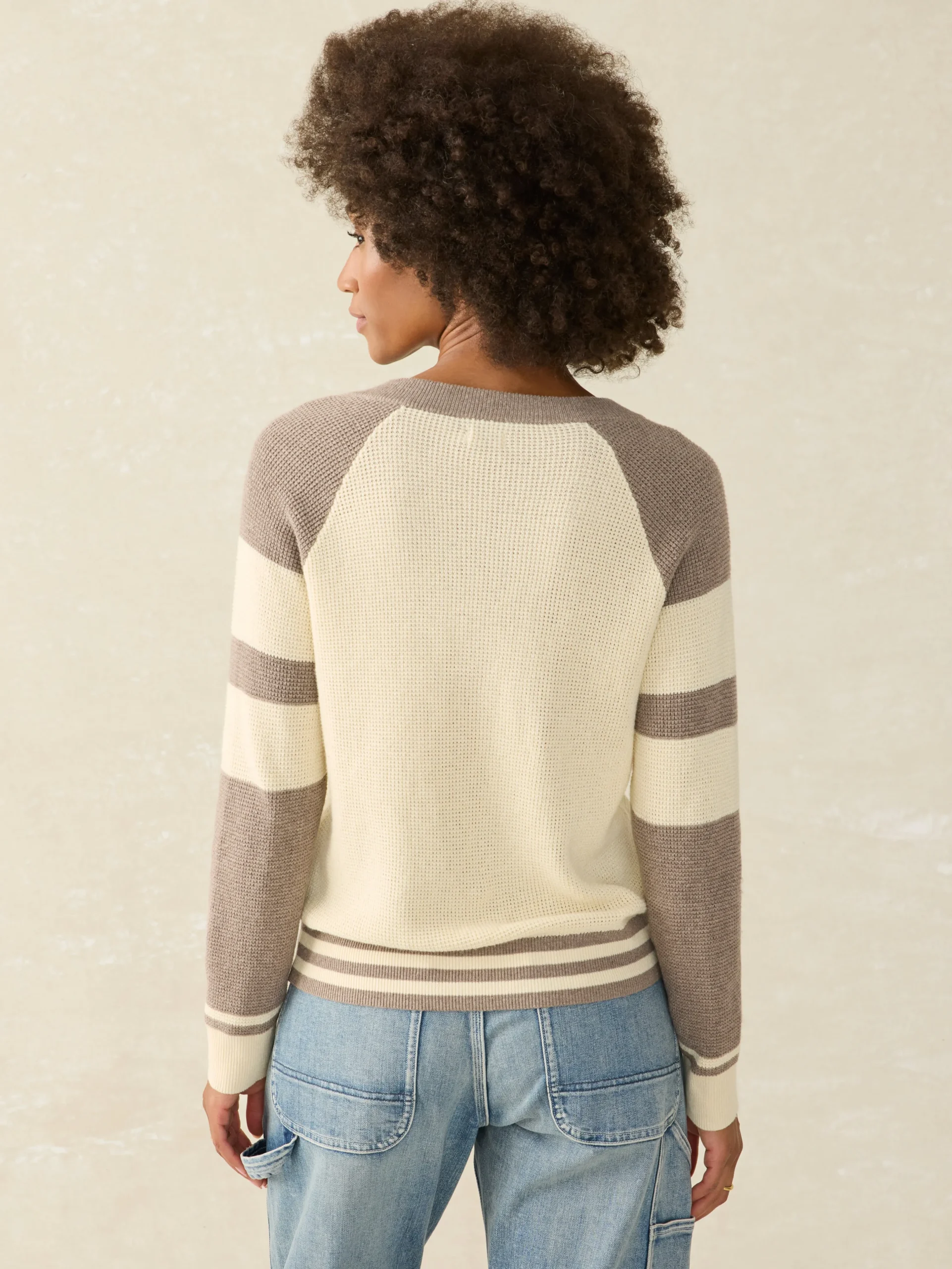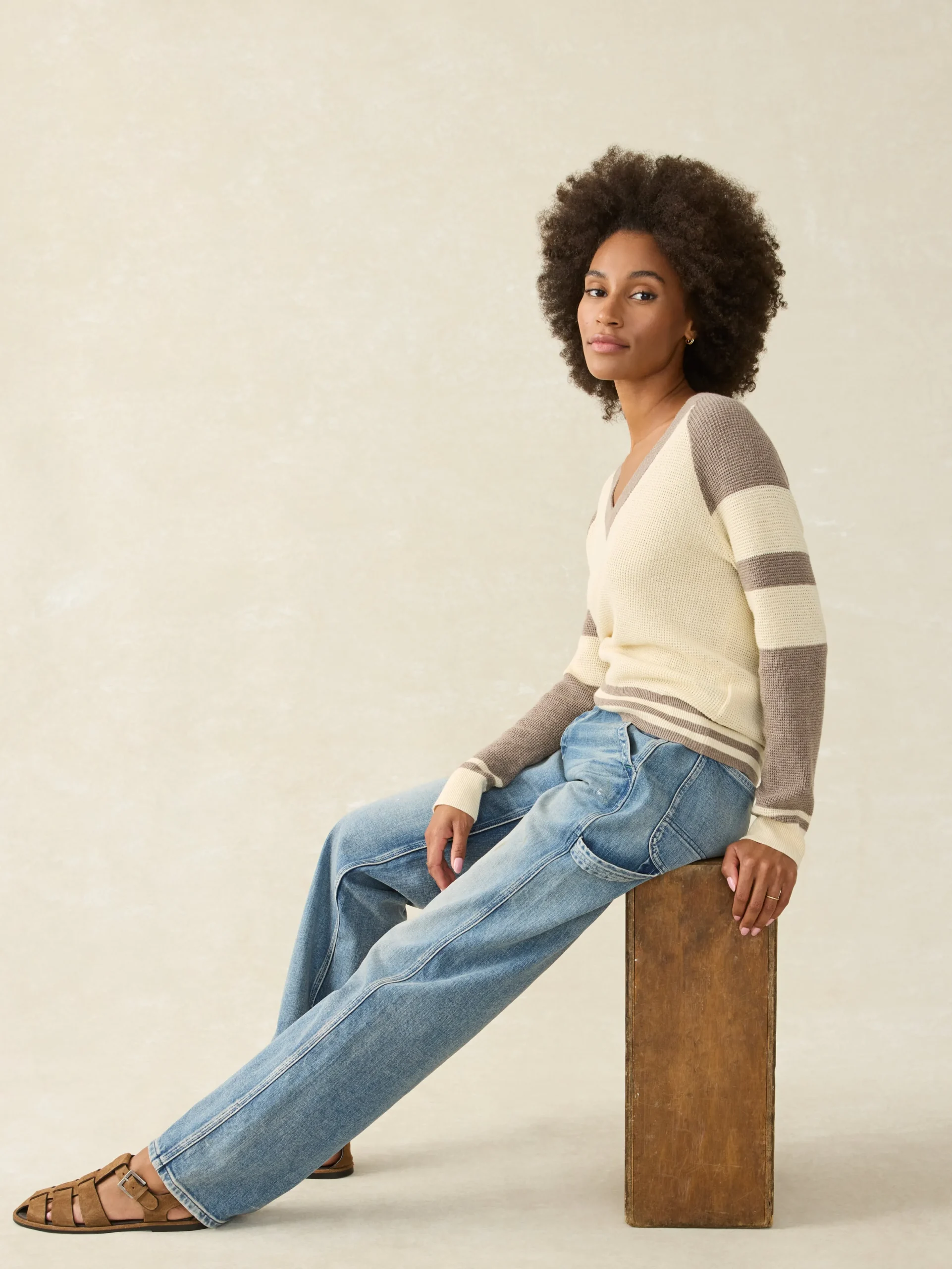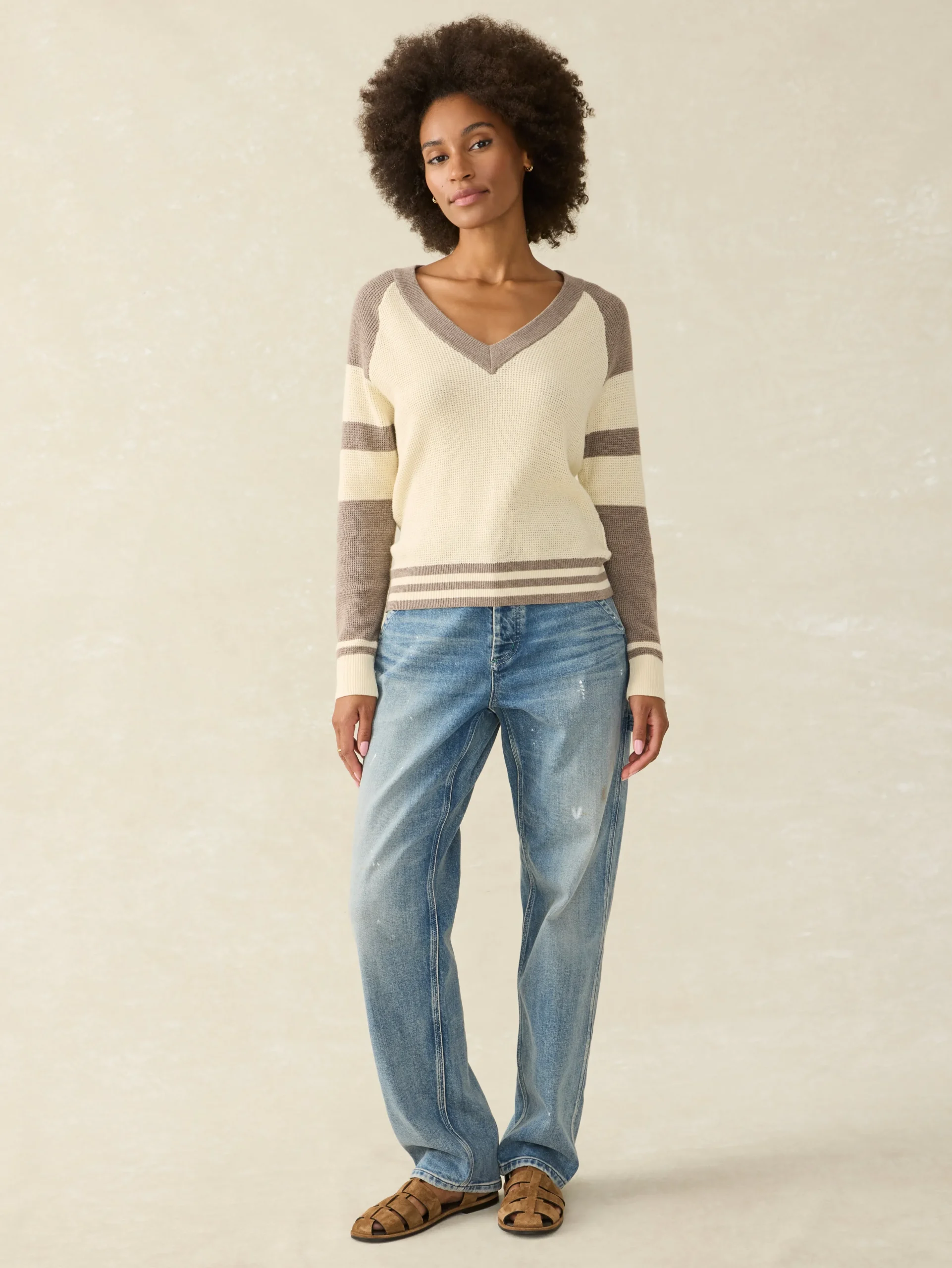 With a nod to nostalgic collegiate sportswear, this classic V-neck gets an elevated update in the softest organic cotton and cashmere yarn. The wonderfully textured waffle stitch lays with a relaxed, no-fuss fit that keeps you toasty and comfy. Play up the sporty stripes and playful colorblocking with jeans or a corduroy skirt for a quintessential fall look.