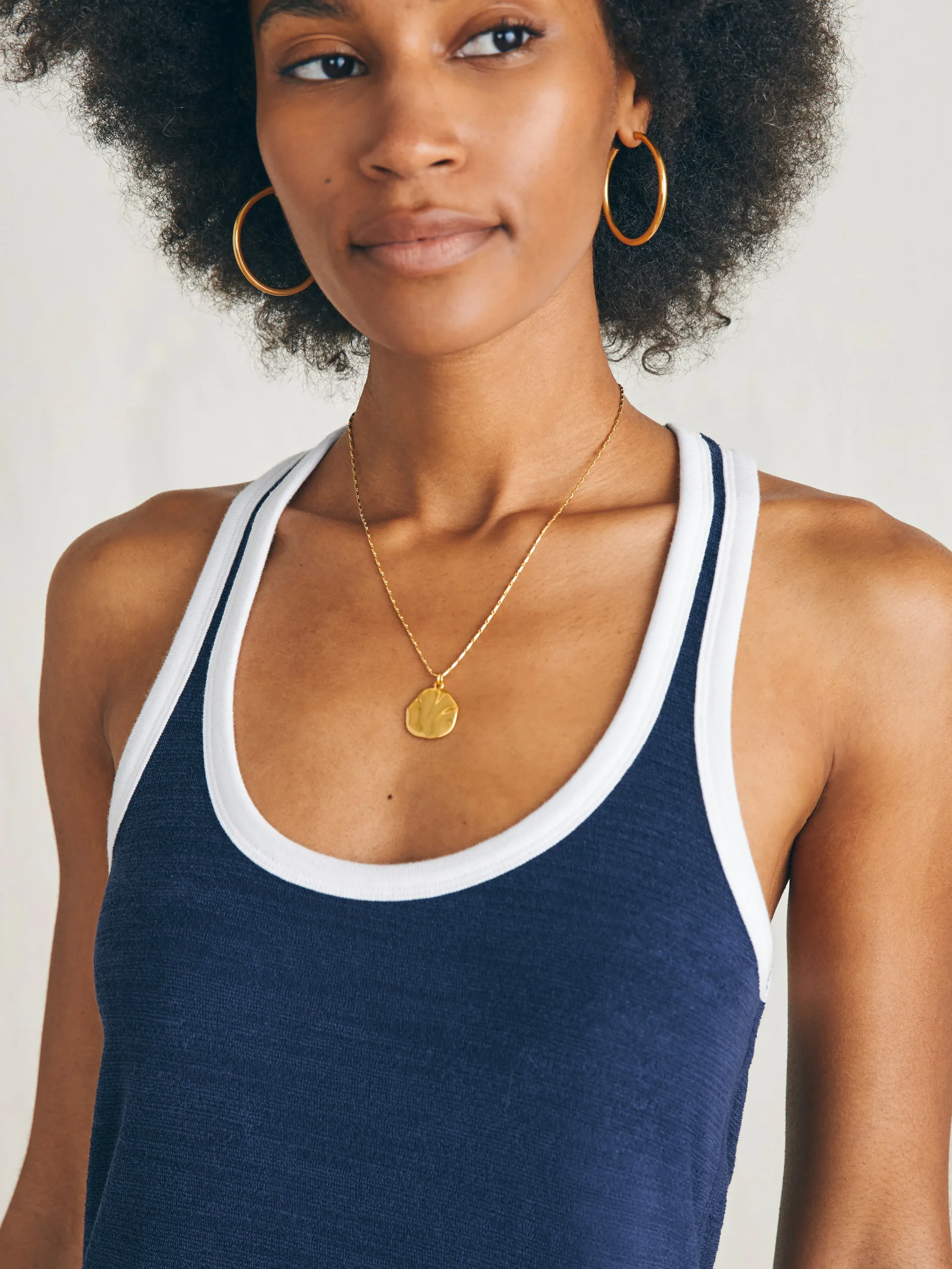 - Detail: Scooped neckline with racerback, contrast binding at neckline and armholes.