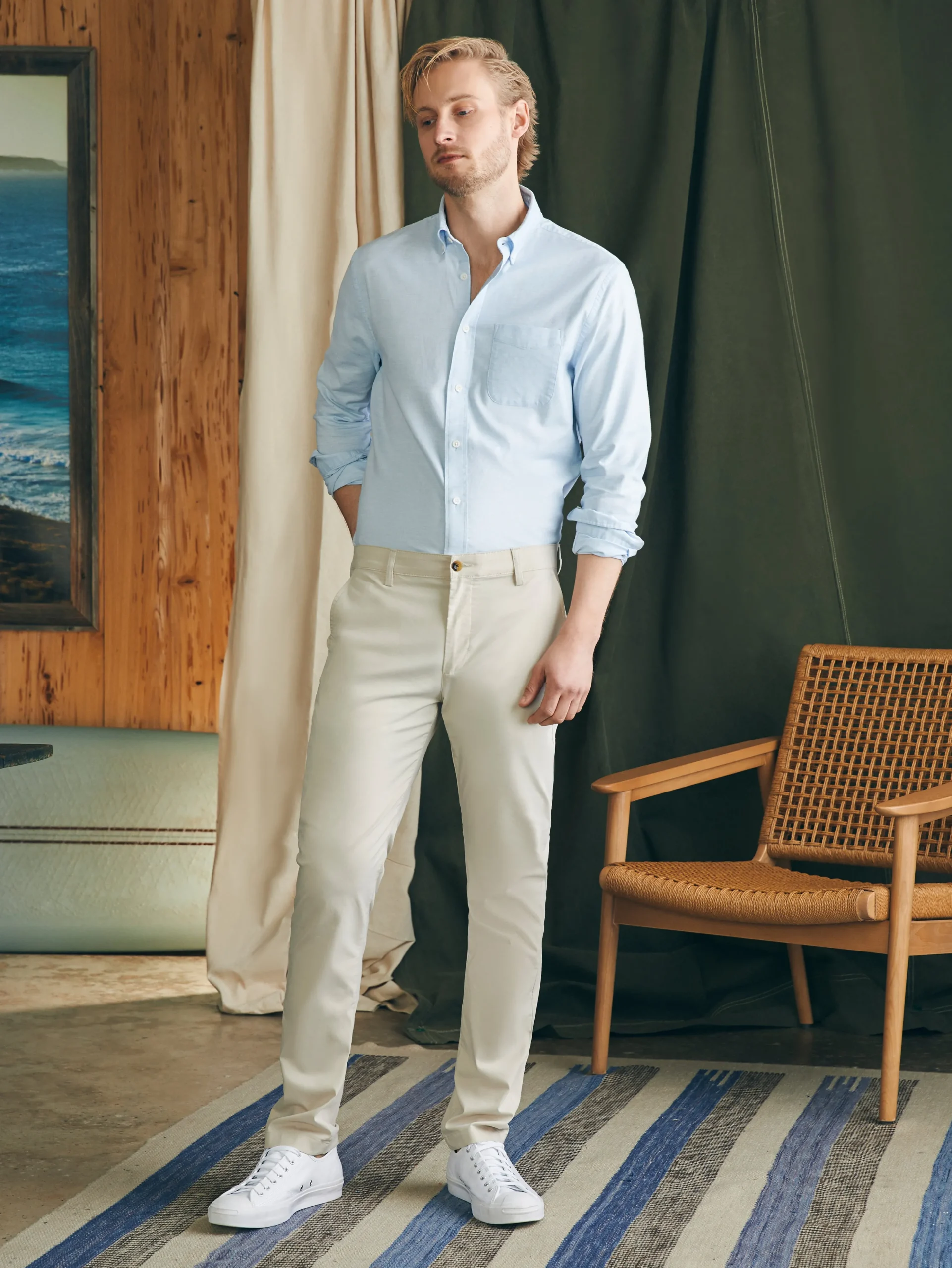 - Detail: Faherty branded horn button closure. Zipper fly. Zipper closure at wearer’s right back welt pocket. Button closure at wearer’s left back welt pocket. Elastic interior waistband for added comfort and a better fit.
