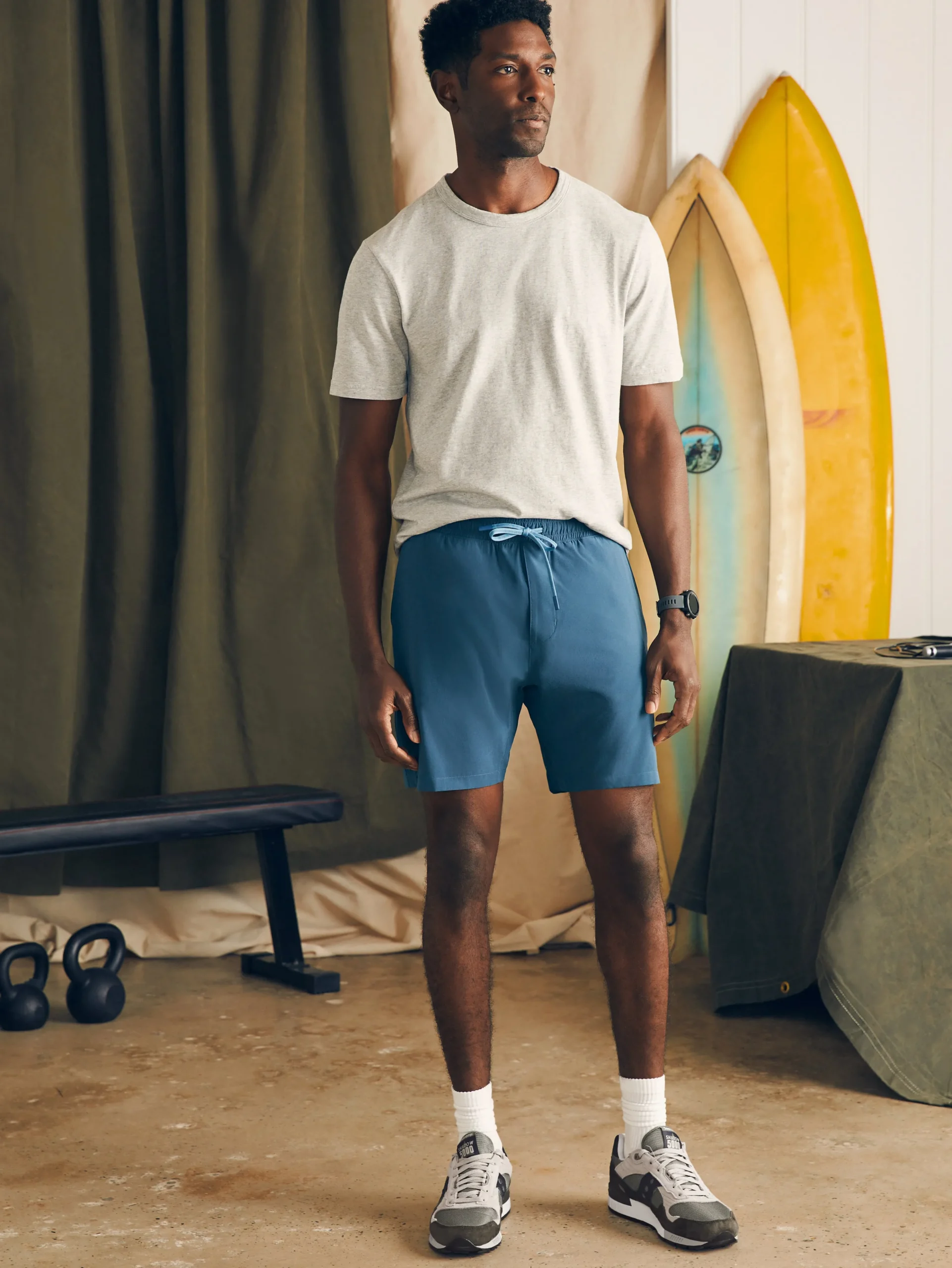 - Fit: 7″ inseam. Relaxed, loose fit through the leg. Elasticated, pull-on waist. 3″ inseam compression liner.