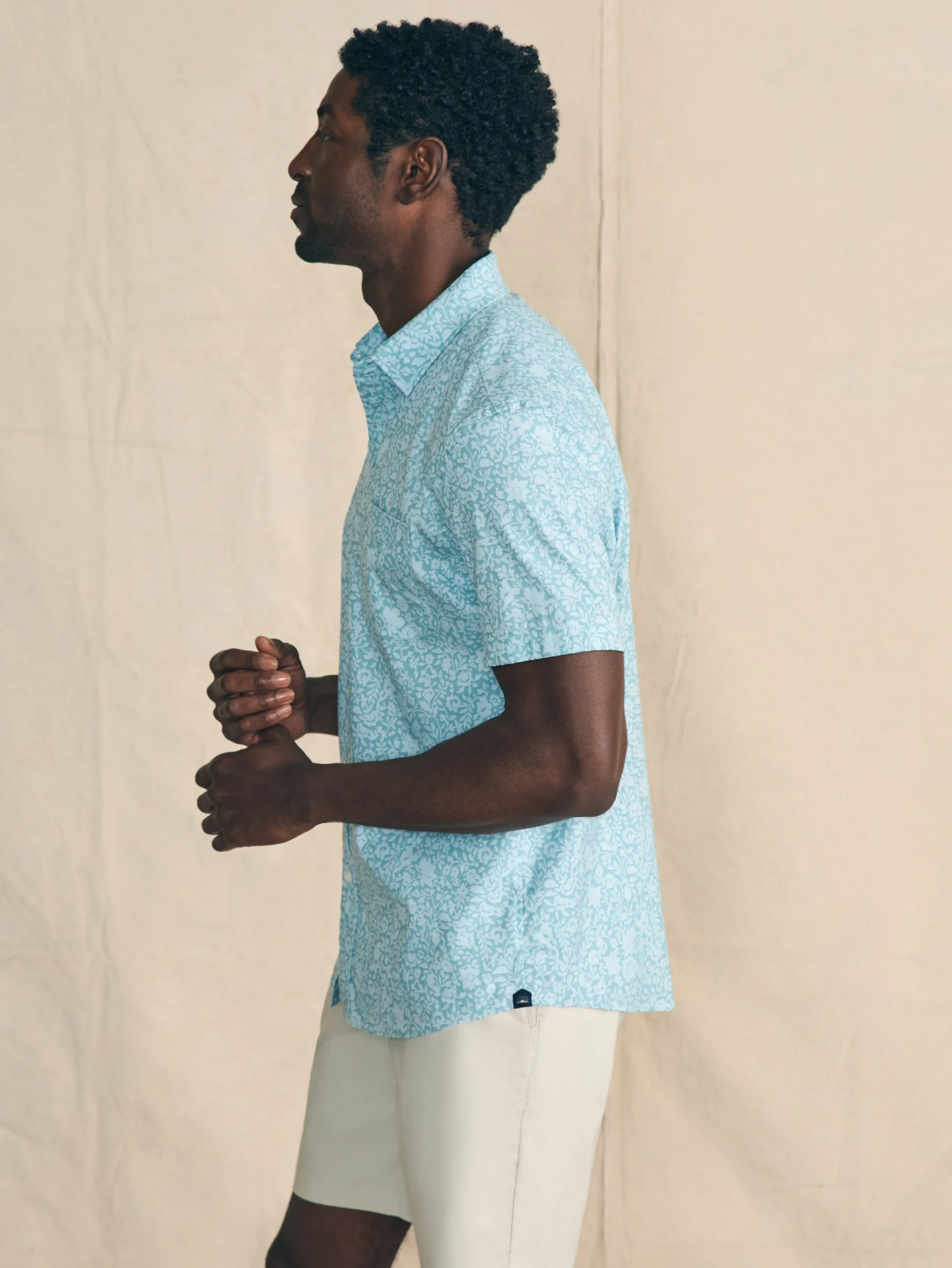 - Detail: Spread collar with concealed buttons to prevent fly-away. Button front placket. Short sleeves. Bungee locker loop. Shirttail hem.