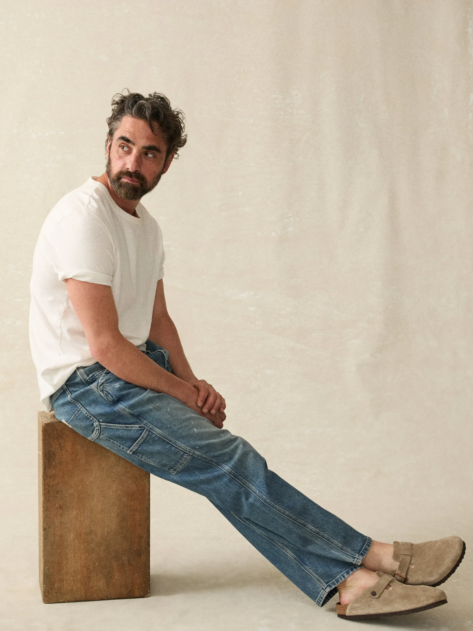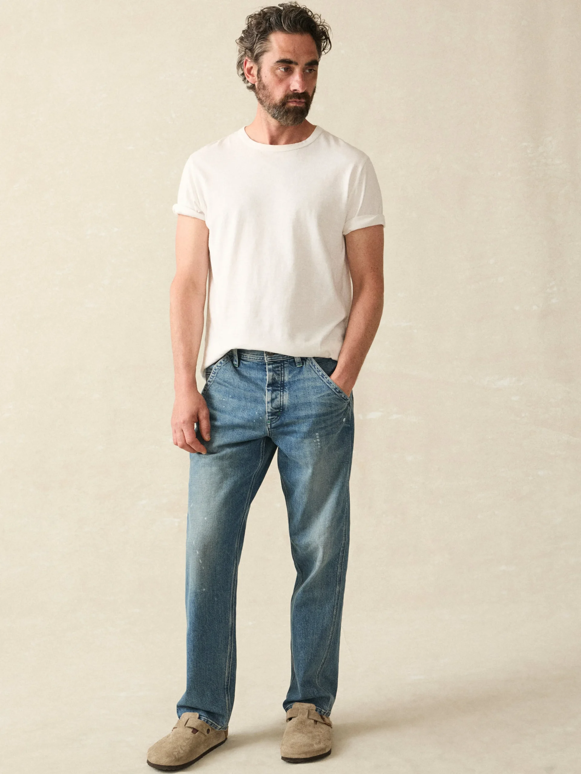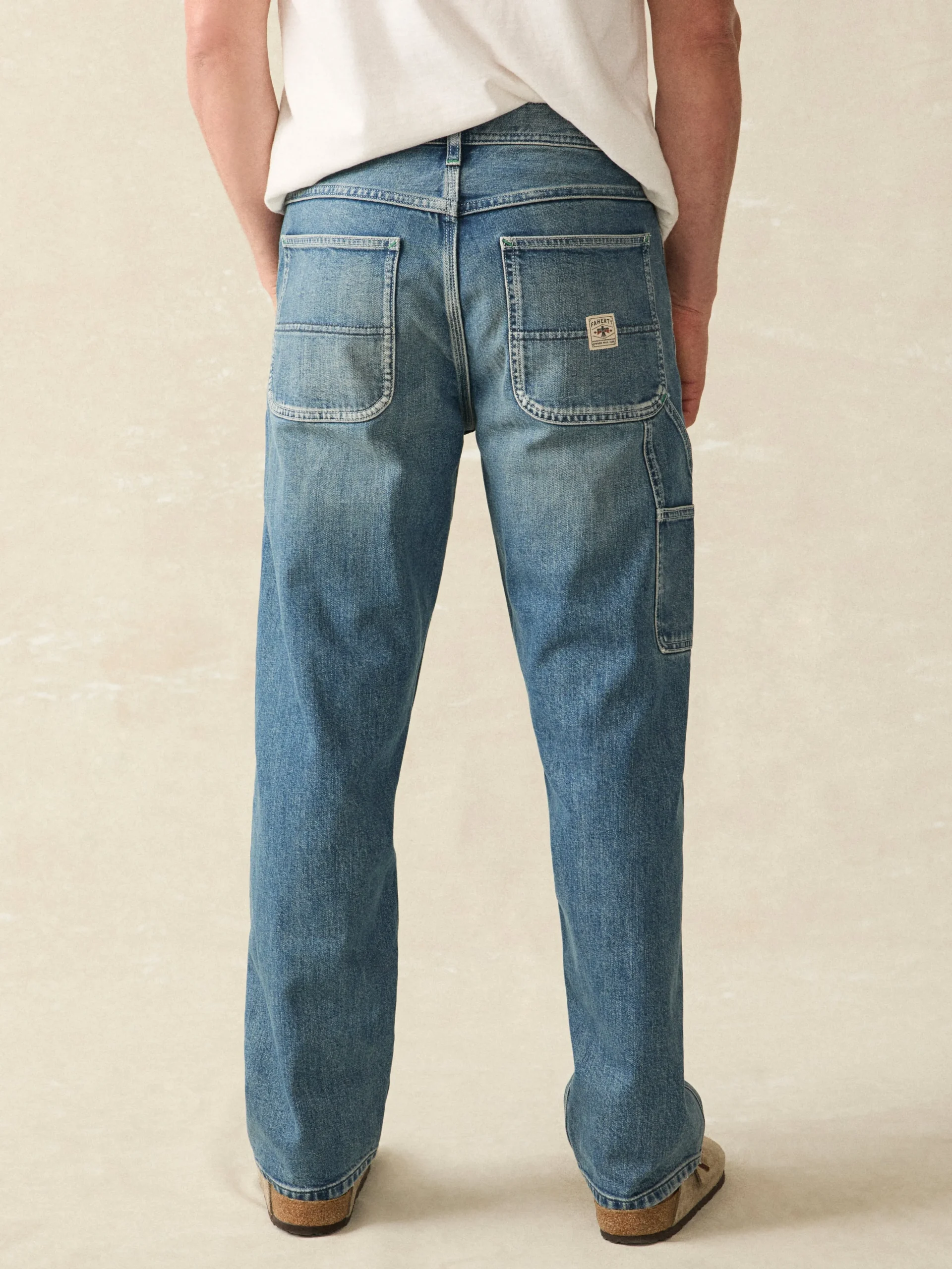- Detail: Denim 5 pocket carpenter pant. Painters pocket at wearer’s right back leg. Comfort stretch. Light Indigo wash with very mild fading.
