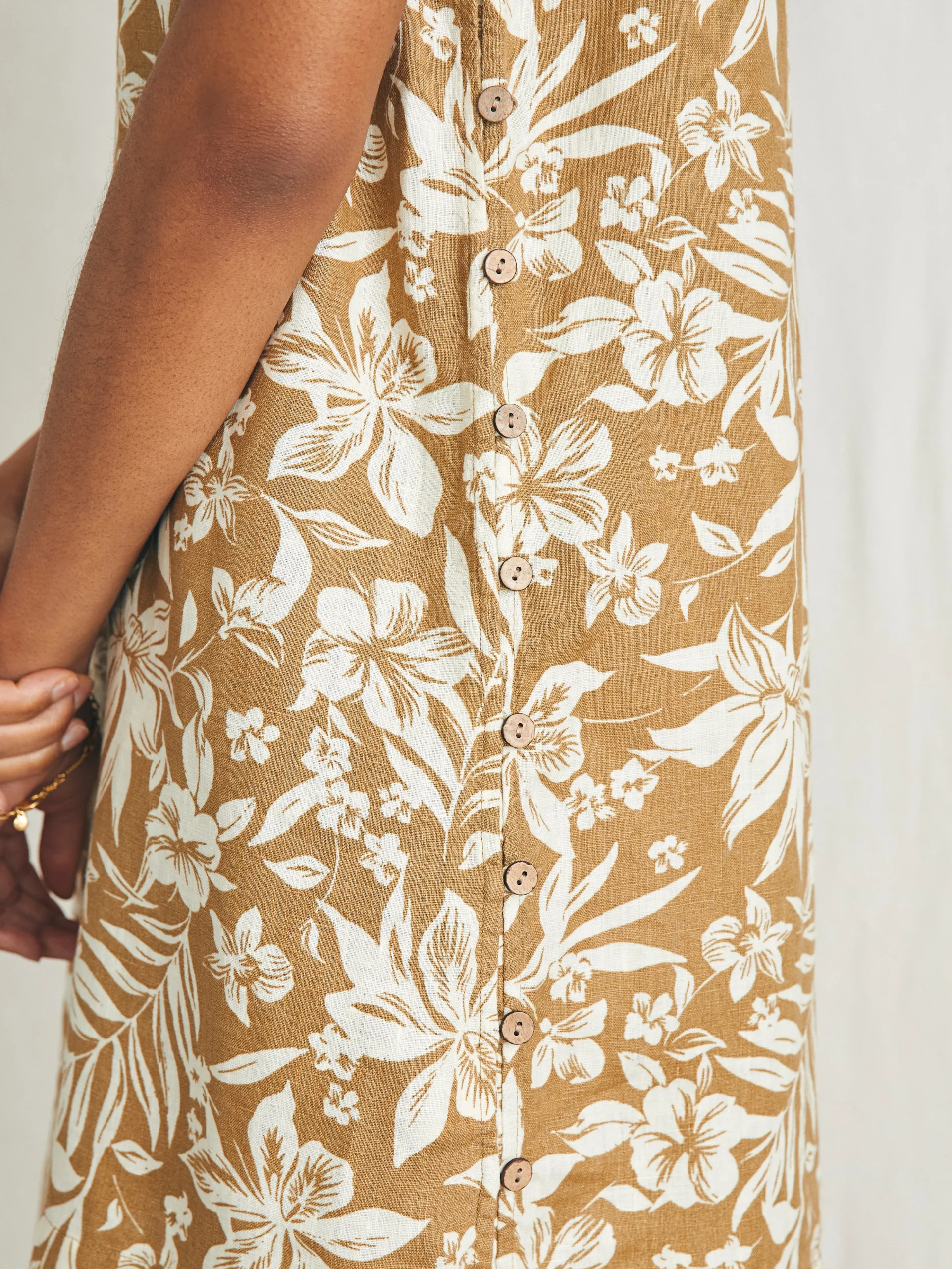 - Detail: Shift dress with coconut buttons along side seam. Keyhole at back neck.