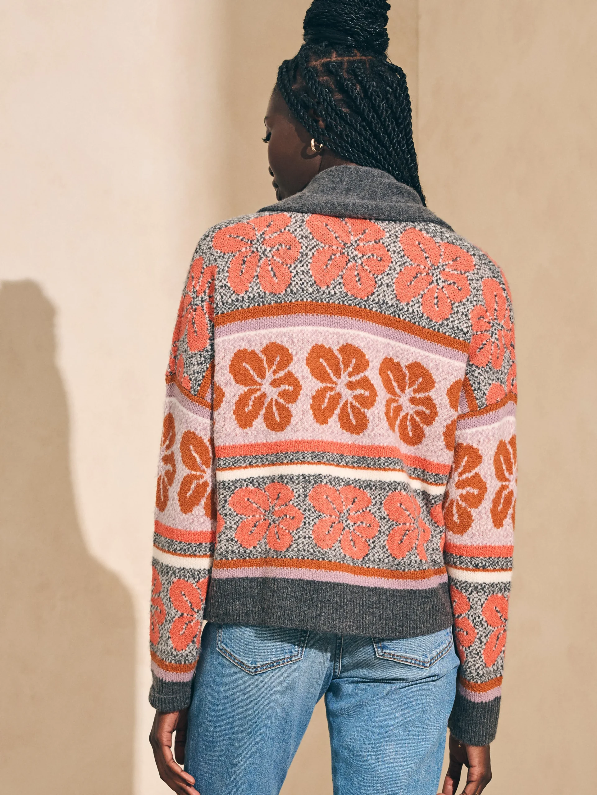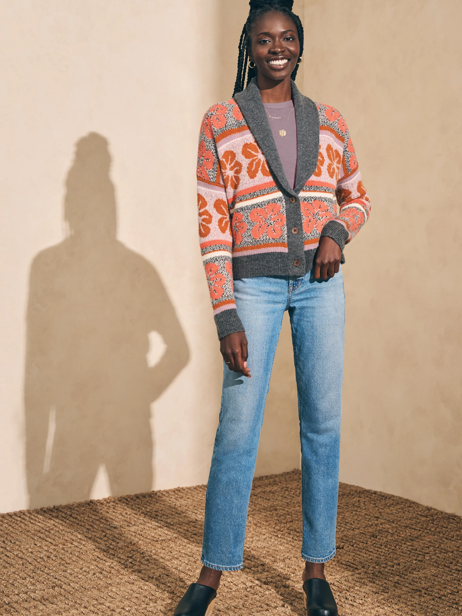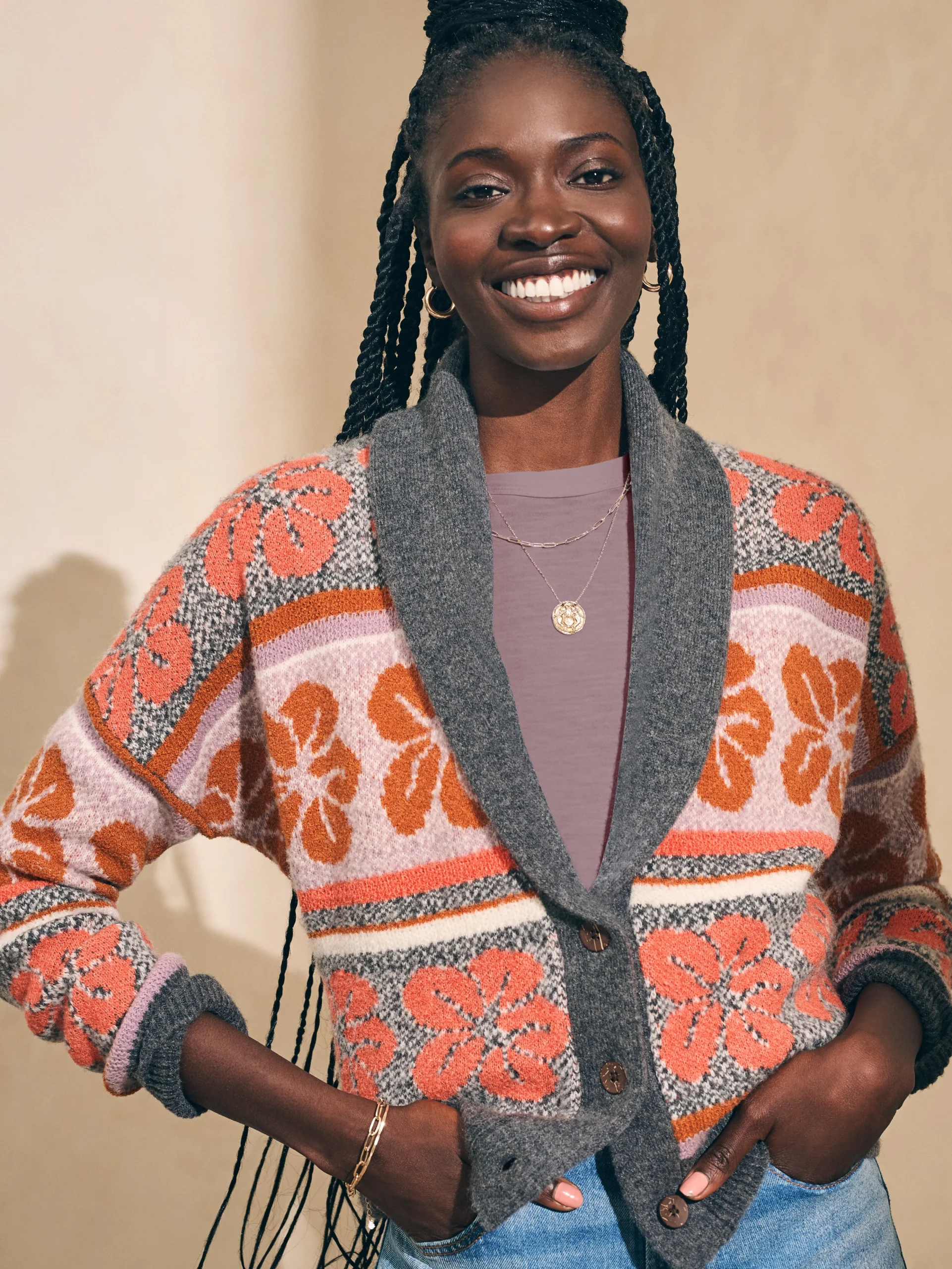 Layer on the charm with our goes-over-everything cardigan knit in a colorful jacquard pattern inspired by the sunsets of Topanga Canyon. This easy statement piece fits like a dream with a beautiful drape from the finest merino wool and cashmere blended yarns. With considered details like a cozy shawl collar, rib trim, and real coconut buttons, it’s the perfect piece to throw on in a chilly office or on long walks at dusk.